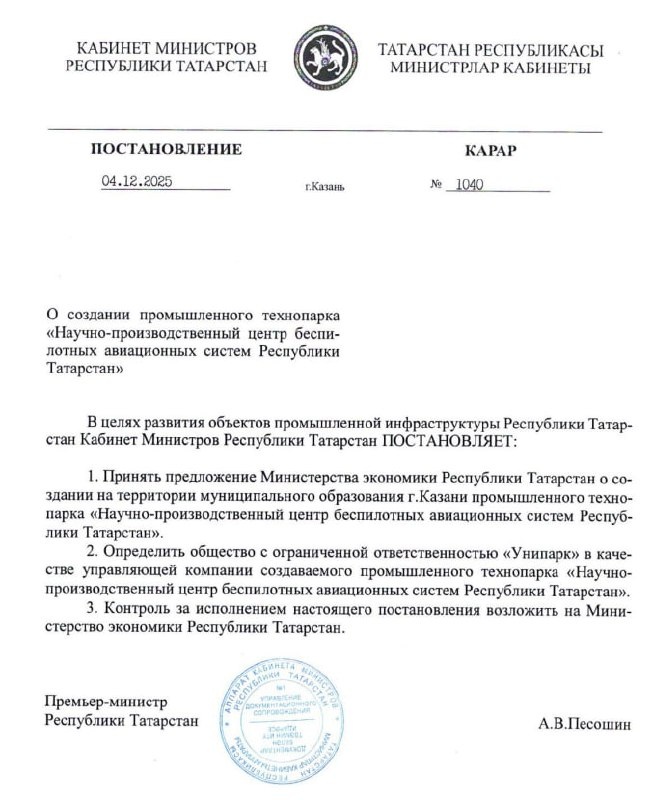 В ответ на пост 🇷🇺🛩В Татарстане появится научно-производственный центр беспилотных авиасистем Документ подписал Премьер-министр РТ Алексей Песошин. @tatmediaofficial | Все каналы Татмедиа ™️ 1-й новостной MAX-канал Татарстана - подпишитесь.