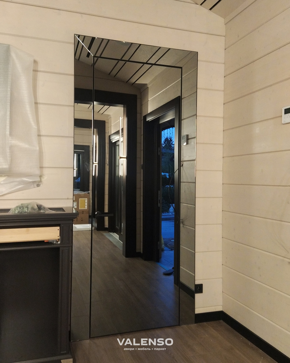 Ещё один тип дверей, который мы установили в интерьере этого загородного дома в коттеджном посёлке Репино Парк, — двери с зеркальным полотном. У них есть одна интересная особенность, задуманная дизайнерами. Помимо зеркального полотна, зеркальными выполнены и наличники. Это решение не только декоративное, но и конструктивно необходимое: в доме из бруса невозможно установить полностью скрытую дверь без наличников — важно учитывать естественную усадку и движение стен. В итоге мы реализовали вариант, где наличники стали логичным продолжением дверного полотна. Благодаря точной подгонке и ювелирной работе с отражающими поверхностями дверь и обрамление образуют единую, идеально ровную плоскость. Главная сложность заключалась в том, чтобы добиться идеальной геометрии и ровных зазоров — как видно на фотографиях, результат получился безупречным. Автор проекта: Ирина Андроненкова.
