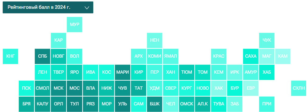 11. Санкт-Петербург, 79,3 40. Новгородская область, 65,4 42. Тюменская область, 64,8 48. Кировская область, 62,6 50. Республика Саха (Якутия), 61,6 55. Ленинградская область, 60,2 57. Псковская область, 60,1 60. ХМАО-Югра, 58,9 62. Калининградская область, 58,1 64. Вологодская область, 56,8 69. Республика Коми, 54,6 71. Архангельская область, 50,6 72. ЯНАО, 50,1 74. Республика Карелия, 47,9 75. Красноярский край, 46,7 76. Чукотский АО, 45,1 77. Мурманская область, 44,9 81. Ненецкий АО, 41,8