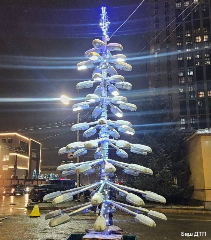😏 Очень яркая елка появилась в Уфе Она стоит на перекрестке улиц Пархоменко и Ибрагимова. Ее сделали из старых городских фонарей. Арт-объект создан сотрудниками «Уфагорсвет» из списанных светильников по энергосервисному контракту. Высота конструкции — более 3 метров, использовано 60 светильников. Елку украсили звездой и гирляндой. #город@ufa_smi Интересное решение — 🔥 📲 Читайте нас в MAX 😀 Подписаться на канал