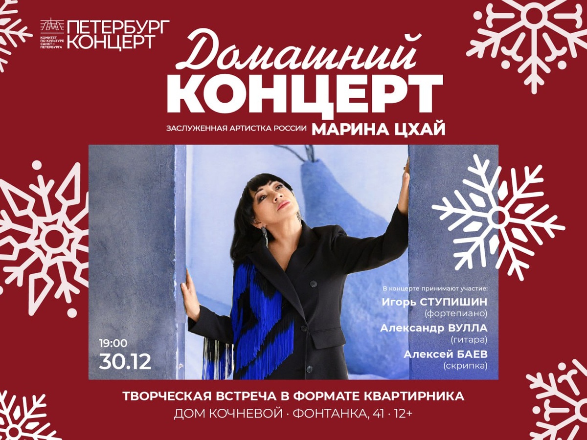 В канун Нового года, 30 декабря, мы приглашаем вас на творческую встречу с заслуженной артисткой России Мариной Цхай. Формат домашнего концерта, располагающий к откровенному разговору, позволит получить ответы на многие вопросы, наверняка накопившиеся у поклонников её творчества. О чем мечтала Марина, сидя у новогодней ёлки, какие песни пела она в детстве и как, спустя годы, маленькая Снегурочка превратилась в заслуженную артистку России. А если вы хотите узнать что-то личное, предназначенное только для вас, то этот вечер — именно то, что нужно. Марина приоткроет вам тайны наступающего года. Кто как не восточная женщина знает столько о восточном календаре и его прогнозах для каждого знака зодиака? Вместе с солисткой «Петербург-концерта» и виртуозными музыкантами — лауреатами международных конкурсов Игорем Ступишиным (фортепиано), Алексеем Баевым (скрипка) и Александром Вуллой (гитара) — мы подготовимся к главному семейному празднику, с которым неизменно связаны самые светлые ожидани
