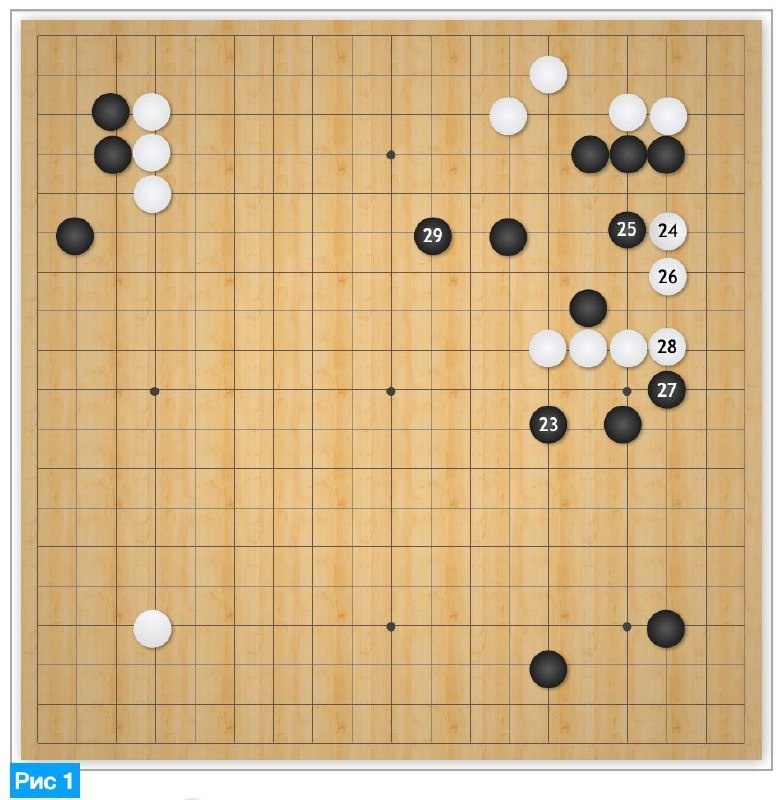 Продолжая тему стратегического терпения, еще несколько ходов партии между Кэ Цзе (Черные) и Ван Цзэжинем (белые). На рисунке 1 борьба между группами на правой стороне. Напомню, что белые навязали черным конфликт. Сейчас он поглощает все ресурсы белых. Черные успевают развивать окружаемую группу и инвестировать в стройку новой области (ходы 23 и 27). Сила и влияние черных камней «перетекает» на новую территорию – внизу справа. А белые заняты выживанием большой группы на правой стороне. Черные позволяют выходить белым в центр, укрепляя мойо справа. На рисунке 2 борьба продолжается. Белые пытаются заставить свою слабую группу работать: атаковать черных. Но черные спокойно отступают в центр. И слабые камни белых оказываются пустой инвестицией. Белые пробуют запустить еще один конфликт. На рисунках 2 и 3 показана стратегия Кэ Цзе, который терпеливо и спокойно делит сферу влияния на правой стороне, зарабатывая очки и мягко гася влияние белых. То, что он делает, похоже на трансформацию п