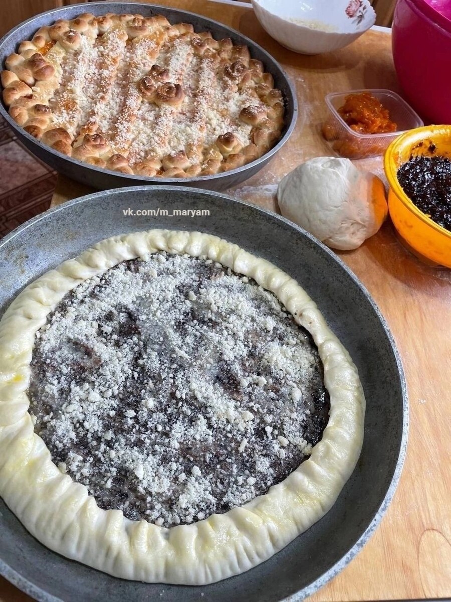 Мәрьям Миңнегуловадан тәмле пирог рецепты. Камыр өчен кирәк булачак: ярты стакан су, ярты стакан сөт, 1 аш калагы майонез, 2 аш кашыгы песок, тоз, 1 чәй калагы чүпрә. Он салып камыр басам. Соңыннан гына басып бетергәндә көнбагыш мае салам чама белән ике уч (салып басам). Эчлек: кара җимешне, сары җимешне кайнар суда тотып алам бераз, аннан блендер белән издерәм+ песок салам+кайнаган су салып сыеклыйм. Өстенә ак сгущенка +чикләвек сибәргә була. Мин чикләвек урынына ак май+песок+он уып сиптем. Чүпрәне иң элек җылы су, песок салып кабартып, күпертеп алам. Камыр сквозняк, суык яратмый. Камырны бик каты басмыйм, озак кына басам. Камырны калын итеп җәймим табага, миңа юка булсын!