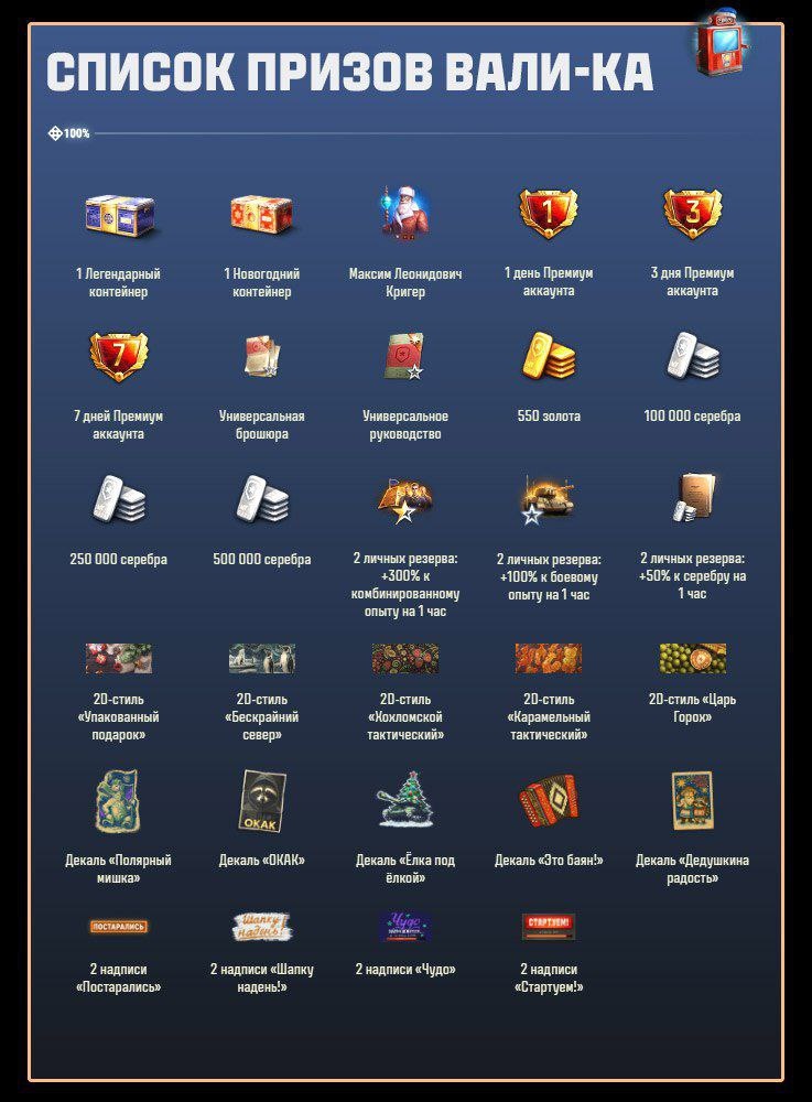 🌵 Расскажем вам про автомат удачи — узнаем, где брать жетоны и посмотрим на полный список наград. 🗞 Кстати, теперь можно обменивать до 10 жетонов одновременно! ㅤ 🟥 Самые ценные награды Вали-Ка: Новогодние и Легендарные контейнеры. А что ещё в списке? Смотрим на картинке поста! 🤖 Робот Вали-К всегда рад гостям и с удовольствием обменяет специальные жетоны на призы. Жетоны для автомата удачи можно получить за выполнение боевых задач Деда Мороза и уход за енотом. А после достижения X уровня атмосферы праздника — за мандарины. 🍊 Курс обмена после достижения X уровня атмосферы: 1000 мандарин = 1