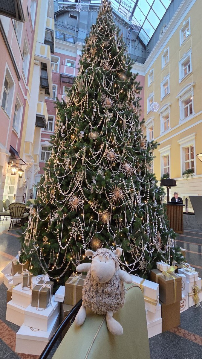 Овца Борис совсем недавно вернулся в Москву, но уже скучает по Петербургу и любимым отелям украшенным к праздникам. В Гранд Отеле Европа всё по старинке, в самом хорошем смысле слова) Высоченная ёлка стоит в атриуме отеля, декорирована жемчужными бусами и блестящими игрушками. В воздухе витает ощущение Андерсеновской сказки, того и гляди, из-за угла выбегут Кай и Герда) #елкиВотелях2026 #грандотельевропа