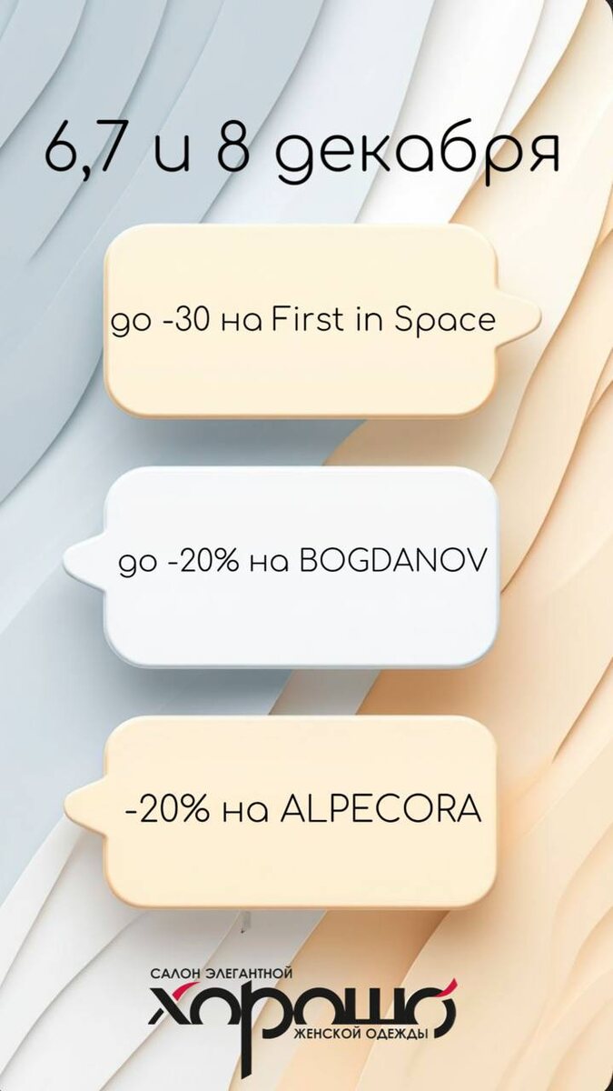 Уже завтра мы ждём с нетерпением нашей с вами встречи в салоне Хорошо! ТЦ ГУМ, 3 этаж, в 14.00❤️ Мы начинаем создавать предновогоднее настроение❄️❄️❄️❄️❄️❄️ И 6, 7, 8 декабря — дни, когда волшебство становится реальностью, а мечты о стильном обновлении гардероба — легко осуществимы. Мы рады предложить вам СКИДКИ от 15 до 30% на текущие и прошлые коллекции. Позвольте себе немного волшебства и предновогоднего шопинга. 📍салон ХОРОШО