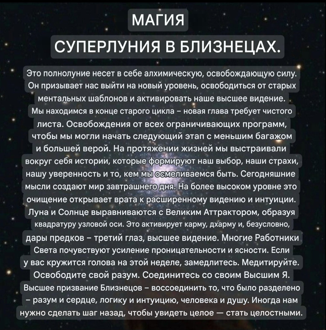 Это Суперлуние в Близнецах несёт в себе невероятную алхимическую, освобождающую силу. Оно призывает нас выйти на новый уровень, оставить позади ментальные ограничения и активировать наше высшее видение. Мы находимся в конце старого цикла — новые главы требуют чистого листа. Освобождение от всех ограничивающих программ, чтобы мы могли начать следующий этап с меньшим багажом и большей верой. Разум играет в этом центральную роль. Это невероятно мощный инструмент — и очень надёжный. На протяжении всей жизни и лет мы развиваем определённые мысли, истории, которые выстраиваем вокруг своего опыта и того, как мы видим себя. Они становятся нашей идентичностью: сетью нейронных связей, фильтрующих всё, что мы переживаем, через нашу индивидуальную призму. Эти паттерны формируют наш выбор и реакции — нашу веру и наши страхи, нашу уверенность и наши сомнения, то, кем мы осмеливаемся быть и что делать… и что мы не осмеливаемся. Пришло время раз и навсегда очистить прошлое, наши устаревшие идентич