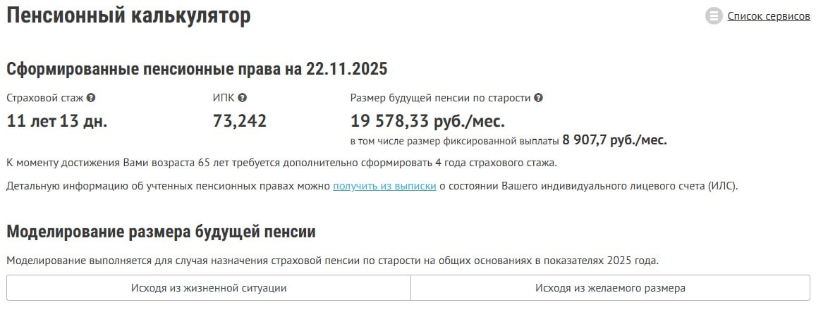 Это моя будущая пенсия — она всего лишь чуть больше коммуналки в квартире, в которой я живу. Кому интересно, вот официальный калькулятор от государства, с расчетом вашей пенсии: https://es.pfrf.ru/pensCalc/ Для многих такой расчёт может стать настоящим «холодным душем».