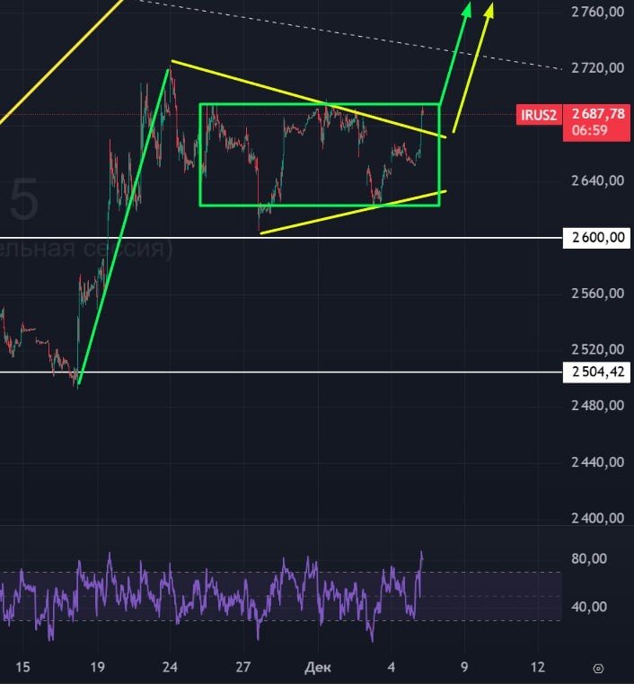 В ответ на пост 🏦 Индекс Мосбиржи 🟢По графику IRUS полностью закрыт гэп, который был получен после переговоров Путин+Уиткофф. 🟢 Если сейчас смотреть на график, то есть два варианта: 1️⃣ Желтый треугольник. В этом случае мы его уже пробили вверх, движение состоится вверх на его высоту. 2️⃣ Зеленое накопление. Поджались к верхней границе. В случае пробоя будет выход на высоту накопления или высоту всего флага. 🚗 Жду вверх индекс, он все еще выглядит сильным для меня. Впереди важные сопротивления, при пробое которых блогеры-трейдеры начнут активно превращаться из всепропальщиков в гойдапроповедников. #индекс #рубль #индексмосбиржи #ММВБ #IRUS #MXI #MIX #IMOEXF #bogdanoffinvest