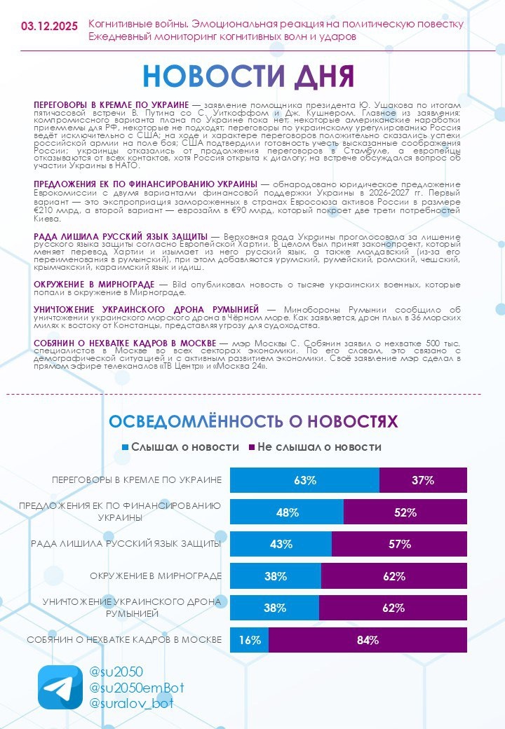 Отчет по результатам опроса бота-измерителя 2.0 03.12.2025 🔹 Стабильное большинство наших респондентов (63%) находятся в спокойном состоянии. Усталость отметили 18%, бодрость – 9%, нервозность держится на низком уровне (4%). 🔹Наиболее известной оказалась новость о переговорах В. Путина в Кремле с представителями США С. Уиткоффом и Дж. Кушнером об Украине (63% слышали об этом). 🔹 К самой позитивной новости об окружении солдат ВСУ в Мирнограде 63% опрошенных отнеслись нейтрально, 57% из них ожидали подобных новостей, 12% – одобрительно, 11% – были удивлены, 5% выразили надежду. 🔹 Хуже всего была воспринята новость о решении Верховной рады Украины лишить русский язык защиты согласно Европейской Хартии. 43% отнеслись к этой новости нейтрально, 23% испытали отвращение, 12% – раздражение, 9% – ненависть. 🔹 45% участников опроса затруднились с выбором новости, похожей на инфовброс, а вот 21% посчитали инфовбросом новость о переговорах в Кремле. ❓ Уважаемые читатели, в связи с заяв