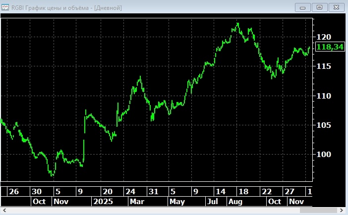 Закрепление выше 118,2п откроет индексу RGBI дорогу к 118,95п - БКС Экспресс Закрепление индекса RGBI выше уровня в 118,2 пункта откроет ему дорогу к 118,95 пунктов, говорится в комментарии аналитика Людмилы Рокотянской на портале БКС Экспресс. "Индекс гособлигаций продолжает восхождение наверх и пытается закрепиться выше 118,2п. Если получится, это откроет дорогу для движения к следующей цели/сопротивлению на 118,95п, - пишет эксперт. - Позитивом для гособлигаций служат ожидания по предстоящему заседанию Банка России, позитивные данные по динамике недельной инфляции и ультракрепкий рубль. Со стороны геополитики тоже поступают обнадеживающие сигналы - возможно, рынок долга начал впитывать и этот фактор". Объемы торгов утром довольно высокие, несмотря на эффект пятницы, отмечает Рокотянская. Наибольшие обороты заметны в выпусках ОФЗ серий 26252 и 26253. Настоящее сообщение содержит мнение специалистов инвестиционной компании или банка, полученное Интерфаксом. Такое мнение предоставляетс
