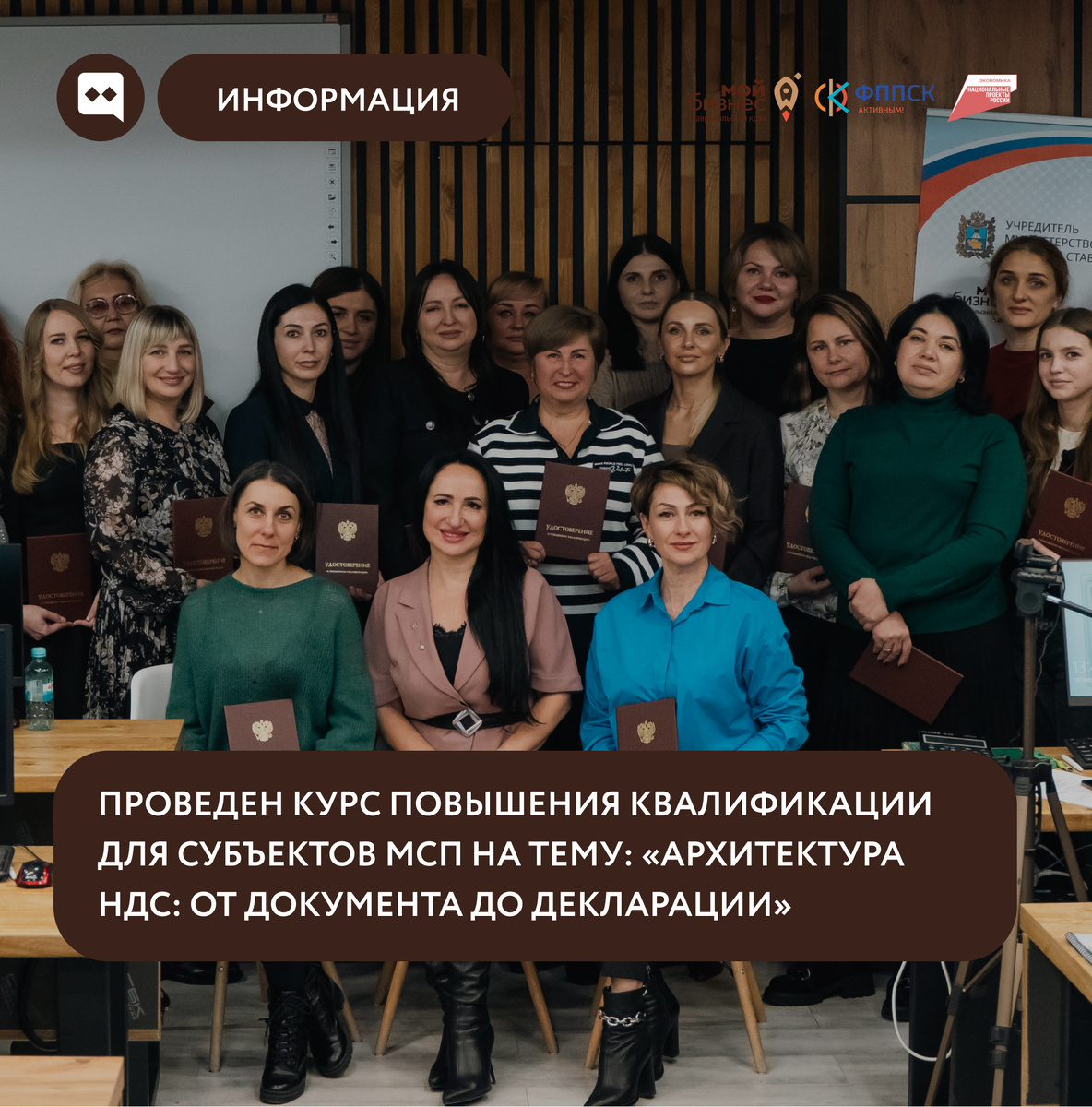 В период с 01 по 04 декабря 2025 года в Ставрополе центром оказания услуг «Мой бизнес», действующим на базе некоммерческой организации «Фонд поддержки предпринимательства в Ставропольском крае», проведен курс повышения квалификации для субъектов малого и среднего предпринимательства Ставропольского края на тему: «Архитектура НДС: от документа до декларации». Программа обучения была разработана для действующих и начинающих индивидуальных предпринимателей и руководителей малого бизнеса, которые хотели систематизировать свои знания и процессы, чтобы минимизировать ошибки, риски и время на подготовку отчётности. Ключевые темы, рассмотренные в рамках курса профессиональными лекторами, включали в себя углубленное изучение вопросов: законодательная база по НДС, освобождение от исполнения обязанностей налогоплательщика, операции, не подлежащие налогообложению, налоговые вычеты и правило 5%, возмещение и восстановление НДС, экспорт и импорт, отчетность и декларация по НДС, ответственность и су