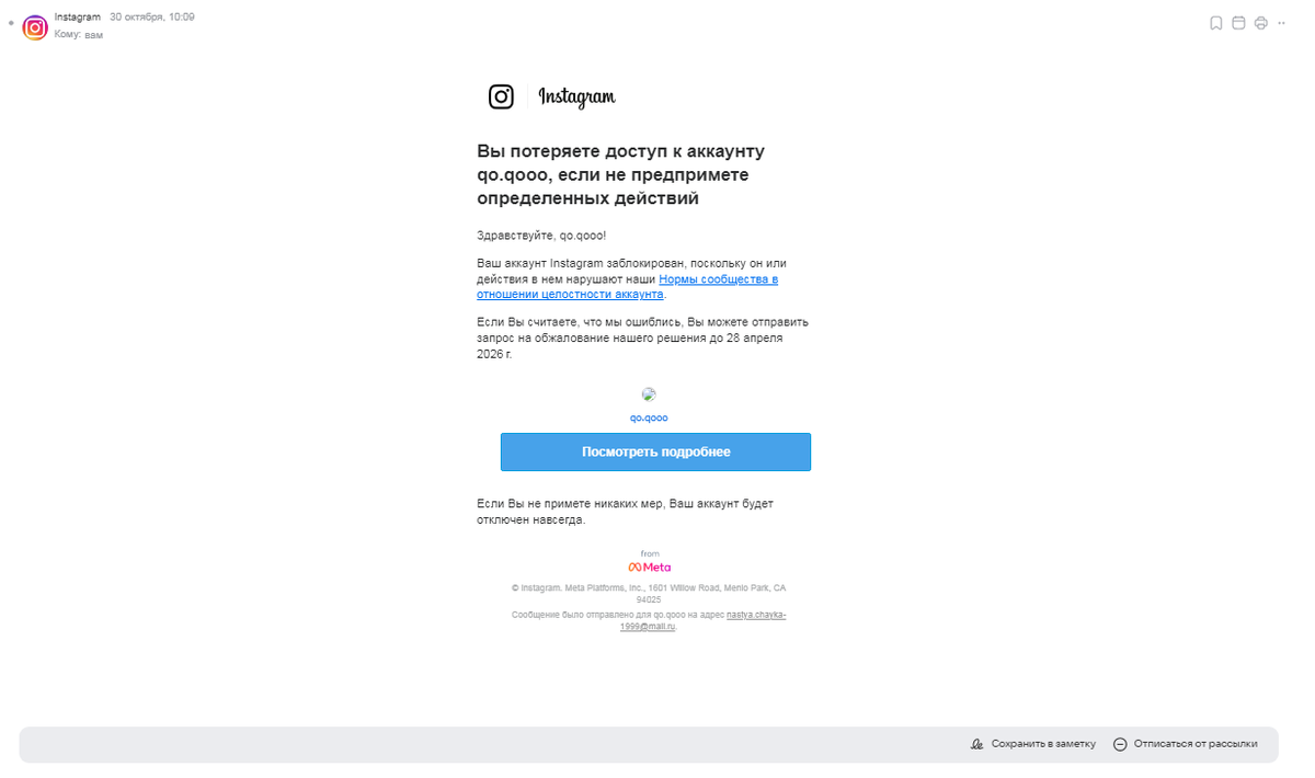 30 октября в 10:09 мне на mail-почту приходит письмо, о том что я могу потерять свой аккаунт. (конечно же я своевременно этого не прочла, а о приостановлении аккаунта узнала только тогда, когда зашла в Instagram*) Я захожу в свой аккаунт в Instagram* и наблюдаю, что аккаунт мой приостановлен. "Осталось 180 дней, чтобы обжаловать наше решение. В противном случае ваш аккаунт будет отключен навсегда." Я в этот же день и в этот же час направила обжаловать решение, отправила видеоселфи на проверку, отправила свой паспорт в качестве подтверждения личности.