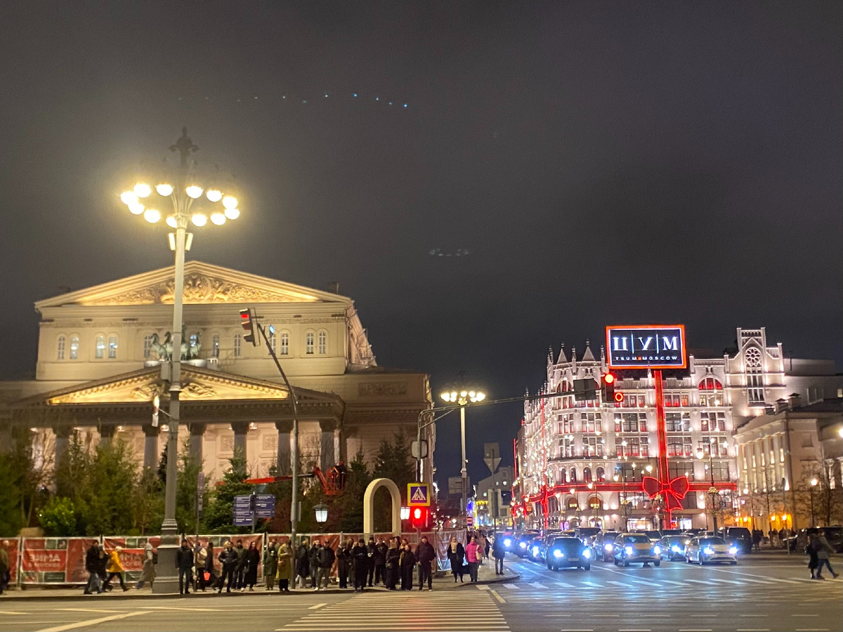 До Нового года ещё целый месяц, вместо морозов и снега – дожди туманы, но предпраздничный марафон уже начался, 1 декабря стартовал фестиваль «Зима в Москве» и столица начала подготовку к самому главному празднику года: Москва включает новогоднюю иллюминацию, развешивает гирлянды на улицах и бульварах, наряжает ёлки на площадях и превращается в прекрасный сказочный город зимних чудес и новогоднего волшебства. На Красной площади, несмотря на теплынь, уже работает каток: Этому катку не страшна тёплая погода: лёд здесь растает при температуре выше +10 ℃. Как всегда перед Новым годом, сверкает огнями ГУМ: В центре Манежной площадки вырос уютный зимний городок с огромной ёлкой и миниатюрными домиками, где можно перекусить и купить сувениры: Ёлка огромная и очень красивая, живая, её привезли из Тверской области и украсили гирляндами и игрушками в стиле советского Нового года: Конечно, это очень красиво и, безусловно, живая ель красивее любой искусственной, но как же её жаль! Столько лет рос