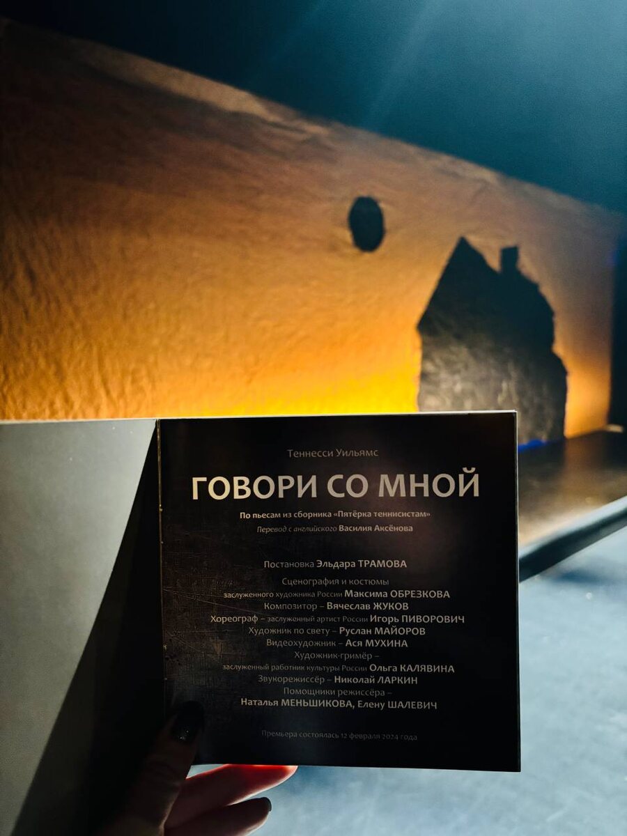 🎭 "Говори со мной" 📍 Театр Вахтангова 📢Реж. Э.Трамов ⏰3 часа 10 минут с антрактом Внезапно удалось зарядиться предновогодним настроением - прогулкой по Арбату до Театра Вахтангова. А после театра я еще раз порадовалась, что Арбат уже украшен, иначе было бы все печально 🙈 Билет на «Говори со мной» от Эльдара Трамова был куплен как-то внезапно, поэтому ожиданий особых от этого спектакля не было. Перед началом я успела прочитать, что поставлен он по пьесам Теннесси Уильямса «Пятёрка теннисистам». Как и большинству, Уильямс мне знаком по «Трамваю «Желание» и «Кошке на раскалённой крыше», так что, конечно, любопытно было немного расширить свои познания относительно его творчества. В постановке представлено 5 историй: «Портрет Мадонны», «Говори со мной словно дождь», «Отчужденная собственность», «В книжном магазине», «Не могу представить, что будет завтра». Каждый из рассказов завершенный, но при этом они связаны друг с другом историей писателя Джо. Поэтому в этом отношении целостнос