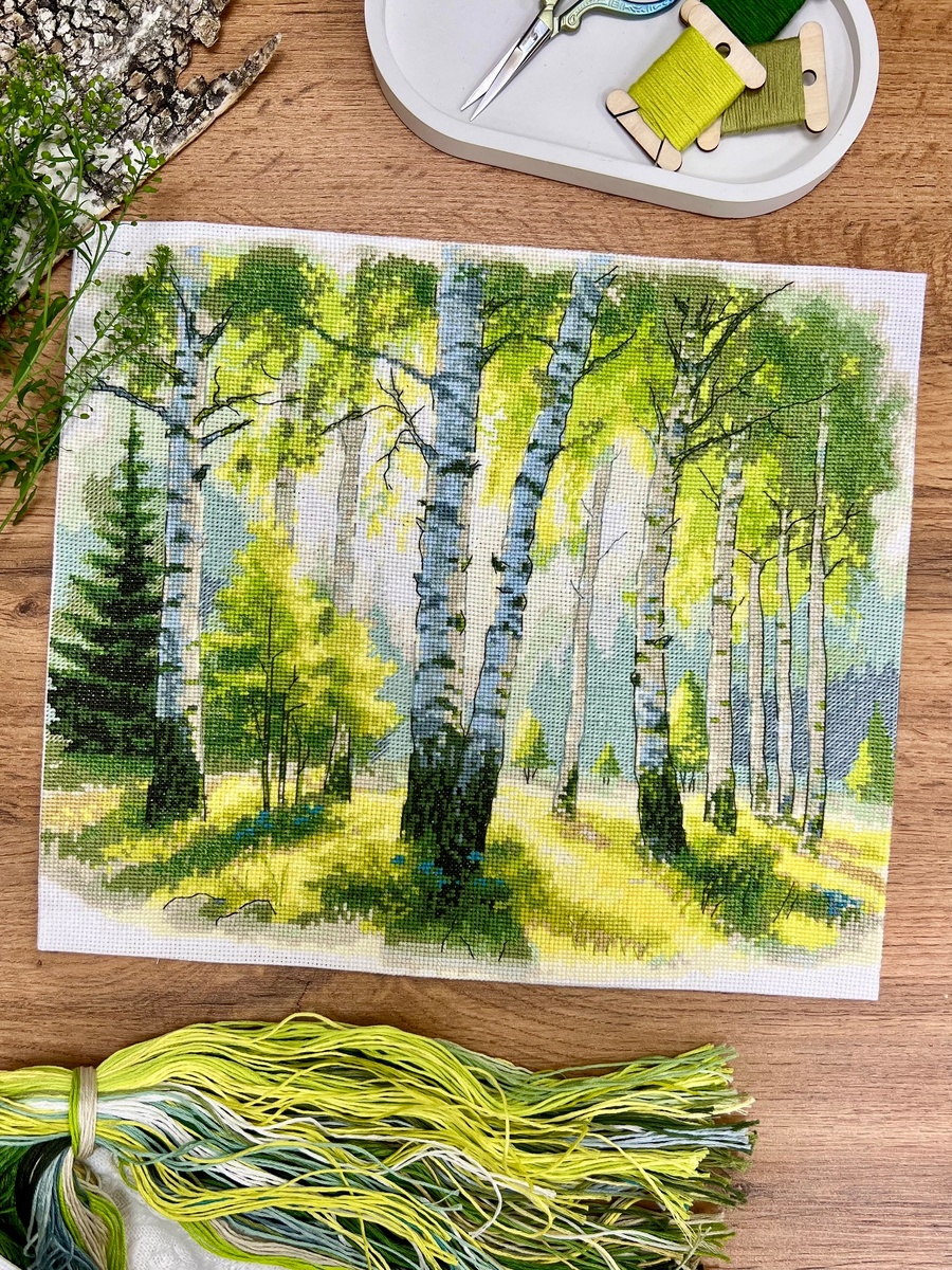 Всем большой вышивальный привет! С тех пор, как дизайнеры стали сотрудничать с фирмами, производящими наборы для вышивания, мои закрома стали пополняться в геометрической прогрессии. Раньше мне много схем дизайнеров нравилось, но я их не покупала, потому что запасов ДМС у меня нет, да и не любитель я всех этих лишних телодвижений -подбери нитки, купи основу, распечатай схему... А теперь как посмотрю на новинки Андриана, Мир вышивки - так хочется купить очень много чего. Конечно, пытаюсь сдерживаться от покупок, но получается не всегда, особенно с новинками от "Мир вышивки". Вот и сейчас - заглянула на их страничку - и поняла, что потрачусь опять, хорошие новинки вышли! Мой фаворит - набор арт. MV-229 “Берёзовая роща”. Канва Aida 16 каунта белого цвета, мулине Royall - 29 цветов; бумажная цветосимвольная схема + ссылка на схему в формате .pdf и Saga. Размер вышитой работы - 31*26,5 см. Цена на Вайлдберриз - 1186 рублей. Очень понравились березки! Такая умиротворяющая, спокойная ка