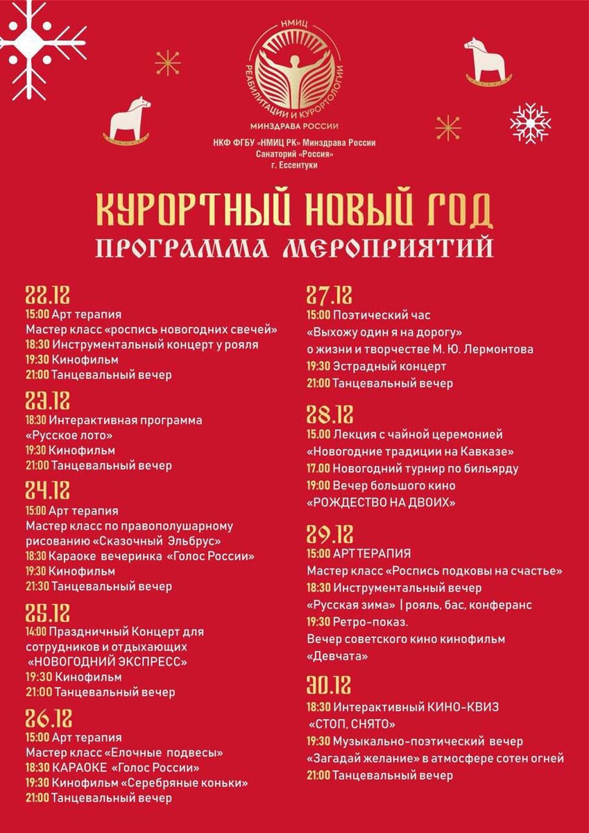 Что делать в санатории на Новогодние каникулы? Вот программа мероприятий санатория "Россия" г. Ессентуки А между этим еще и процедуры будут отпускаться. Скучать будет некогда! И да, новогодняя программа включена в стоимость🟠 путевки. Платить отдельно за новогоднюю ночь не придется А теперь о стоимости: 6000 руб/сутки с чел при размещении в 2-местном номере 7100 руб/сутки при размещении в 1-местном номере Есть свободные номера на декабрь-январь В стоимость включено: 🟩проживание в номерах с удобствами 🟩лечение по профилю санатория 🟩3-х разовое питание 🟩развлекательная программа 🟩новогодняя ночь Бронирование по тел/вотсап/мах +79624264110