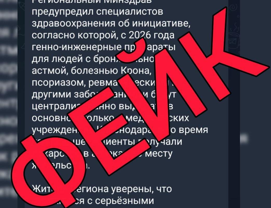 Минздрав Краснодарского края официально опроверг распространяемый в Telegram фейк о том, что жители региона с бронхиальной астмой, болезнью Крона, псориазом, ревматическими и другими тяжёлыми заболеваниями якобы останутся без жизненно важных лекарств или будут вынуждены ежемесячно ездить за ними в Краснодар.