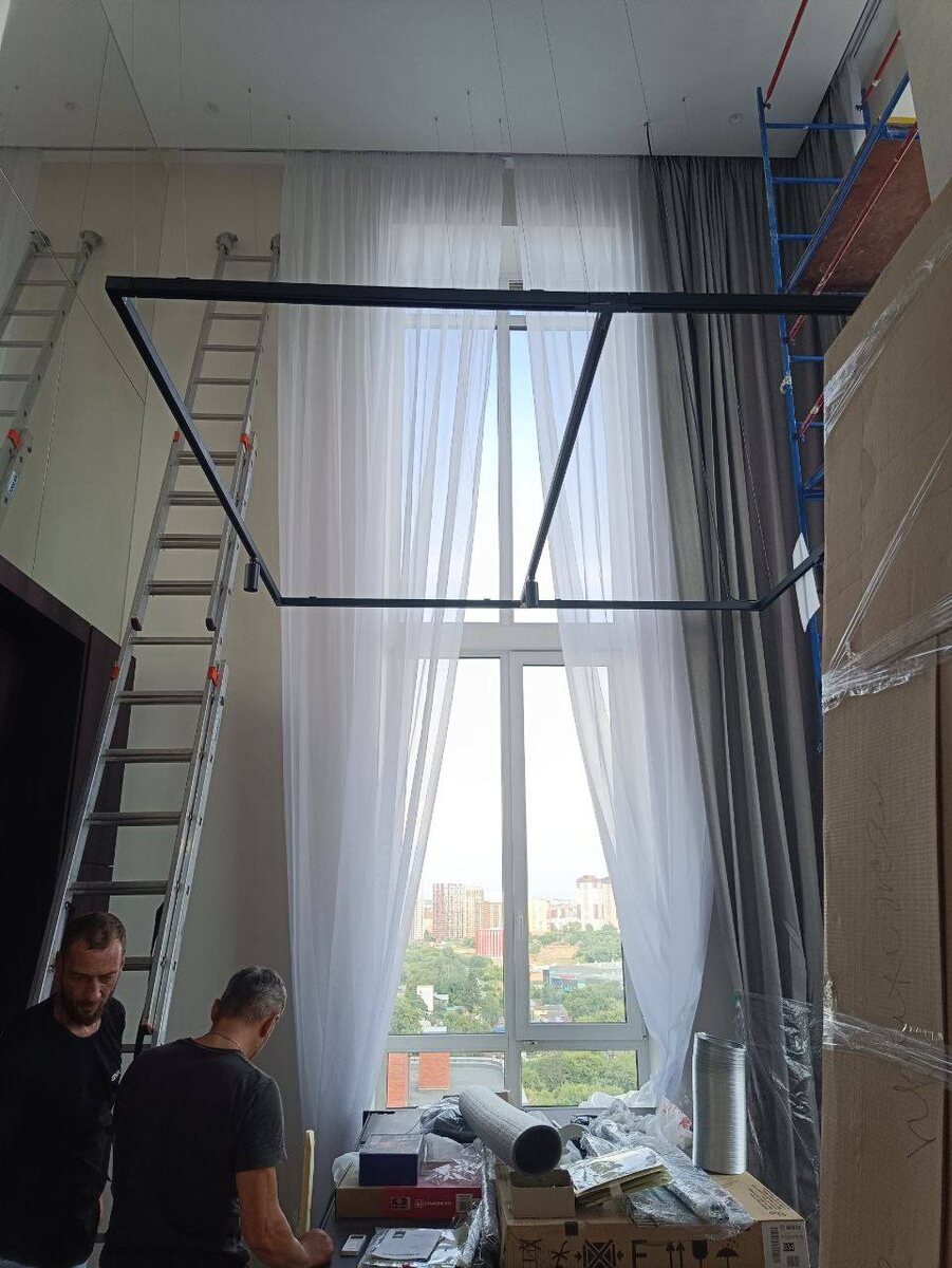 Знаете это чувство, когда в проекте — роскошные высокие потолки, а в голове сразу вопрос: «И как мы будем обслуживать эти конструкции у небес?» 😅 Показали вам в фото весь процесс ОТ навески ДО фотосессии готового интерьера. Так вот, наш вам пламенный совет, выстраданный на лесах и отпаривателях: всё, что выше 3 метров — территория лифт-системы. Точка. Почему это гениально не только для нас, но и для заказчика: 1. Без паники и лесов. Вы просто стоите на полу, как цивилизованный человек, и плавно поднимаете штору/ткань/полотно. Никаких акробатических этюдов на высоте. 2. Скорость = деньги. Монтаж в разы быстрее. Вы экономите время, которое можно потратить на новый заказ или на те самые мемы в комментариях. 3. Безопасность — главный козырь. Никаких рисков для монтажников и для интерьера заказчика. Это самый весомый аргумент. Один раз «позора» с лесами — и достаточно. Дальше — только лифты, только хардкор (но комфортный). P.S. И да — мы обеспечим вам правильные системы монтажа и химчист
