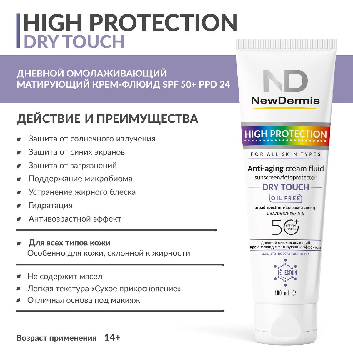 1 шт !!! 1800Р вместо вместо 2550Р HIGH PROTECTION DRY TOUCH - Дневной омолаживающий крем-флюид c матирующим эффектом SPF 50+ PPD 24 Многофункциональное средство с эффективной защитой от всех видов вредных излучений, инновационной текстурой «сухое прикосновение» и матирующим эффектом. Подходит для всех типов кожи, особенно для кожи склонной к жирности. Не содержит жиров и масел (OIL FREE).