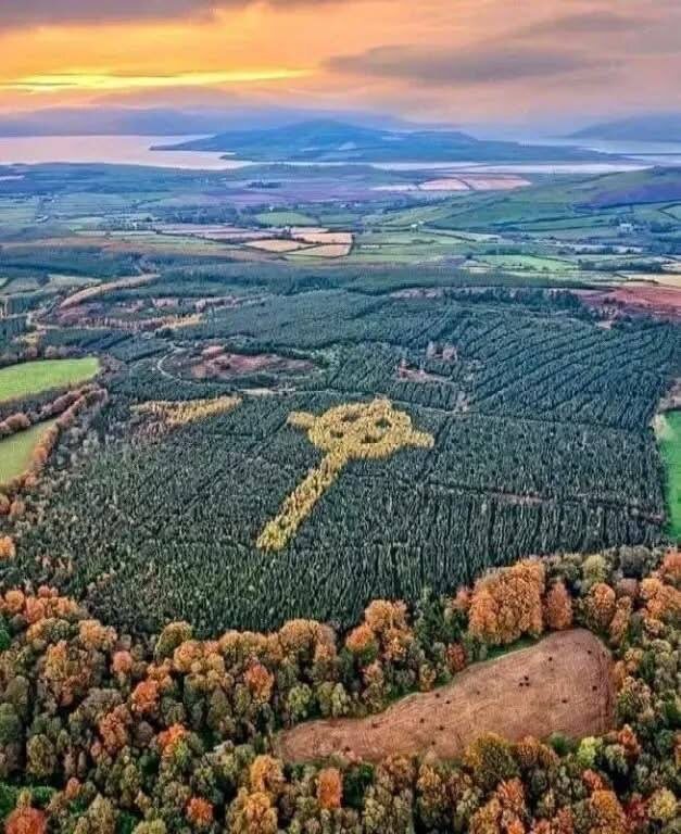 Каждую осень над лесами графства Донегол в Ирландии появляется чудо - огромный золотой кельтский крест, сияющий на фоне тёмно-зелёных сосен. Это не мистический знак и не игра природы. Его создал лесничий Лайам Эммери, высадив среди обычных сосен около 3000 японских лиственниц в особом порядке. Осенью их хвоя желтеет - и крест вспыхивает золотом, как благословение, видимое с неба. Лайам трудился над своей живой композицией 11 лет, а результат мир увидел только спустя ещё столько же - уже после его смерти. В 2016 году пилоты, пролетающие над лесом, впервые заметили это чудо. Эммери почти никому не рассказывал о своём замысле. Он просто сажал деревья - в тишине, с верой и любовью к родной земле. Теперь его творение будет видно ещё десятки лет - как напоминание о человеке, который посеял свет в лесу, и тем самым стал частью самой Ирландии. ☘️