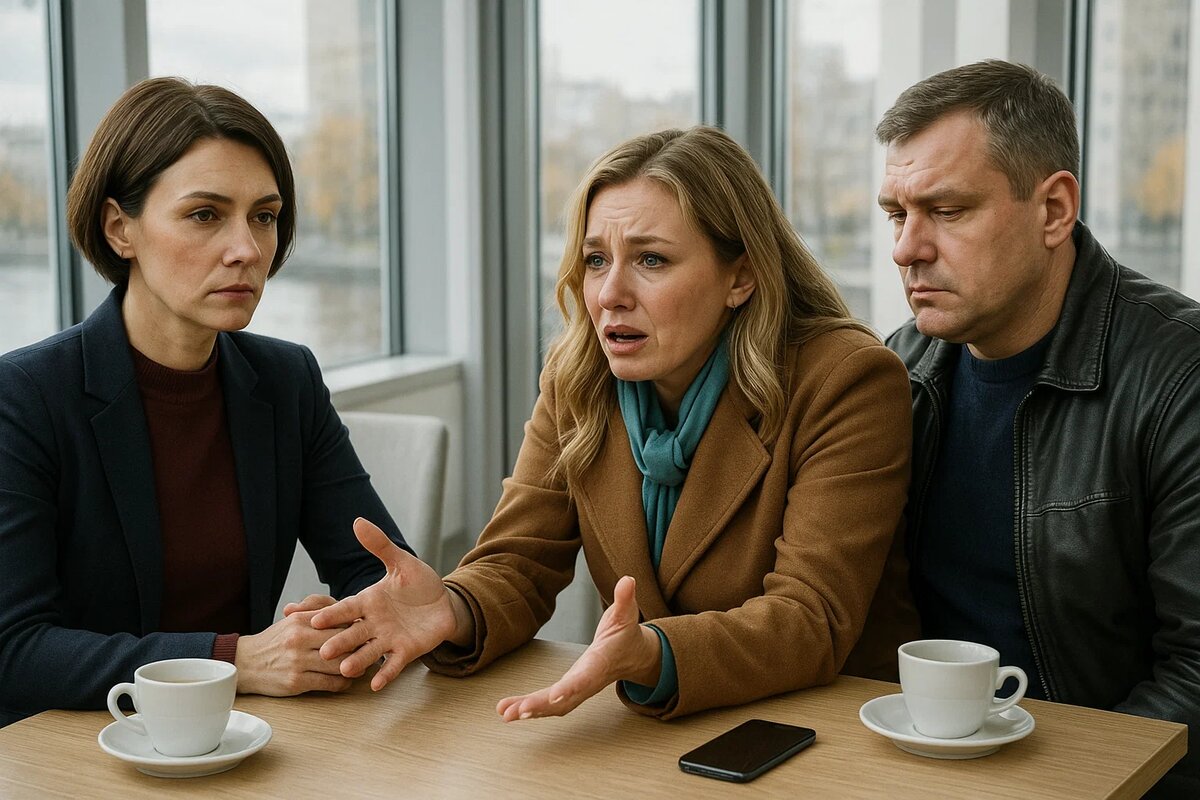 Валентина сидела с идеальной осанкой, капучино не тронут. Олег листал меню, но не читал — руки дрожали. Они пришли вдвоём, как пара. Как будто имели право.