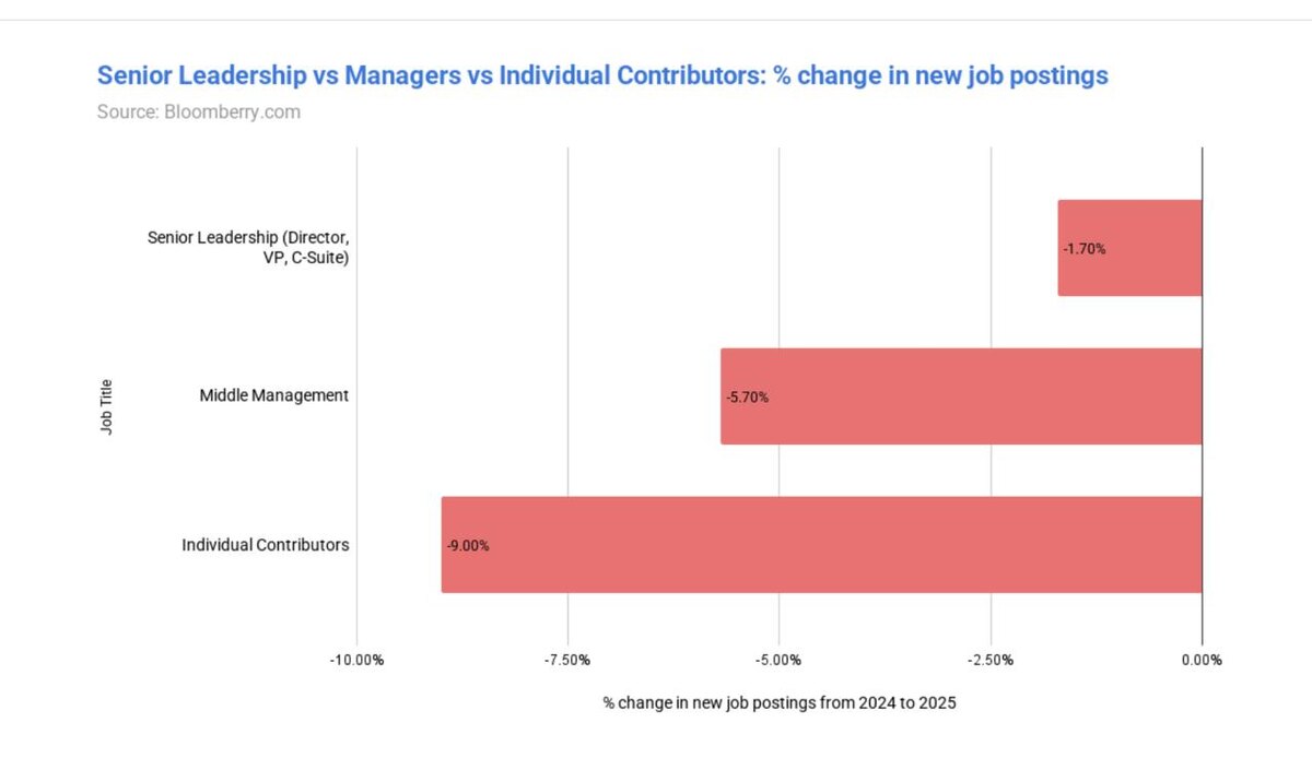 Bloomberry just dropped a fascinating analysis on how AI is shaking up the job market by 2025. Here’s the scoop! 📰 - Overall job vacancies are expected to dip by about 8% compared to 2024—just a little background on the shifts. - Creative roles are taking the hardest hits: - 3D artists down by 33% 🎨 - Photographers down by 28% 📸 - Writers down by 28% ✍️ Employers are less interested in tasks that AI is mastering at lightning speed! - On the flip side, there’s a surge in demand for strategic, technical, and leadership roles. - ML engineers? Up by around +40%! 🚀 That’s where development and investments are heading! 💰 Bloomberry also shared some killer charts that illustrate where the market is moving and which jobs will shape the future of employment. Check it out! 👇 https://bloomberry.com/blog/i-analyzed-180m-jobs-to-see-what-jobs-ai-is-actually-replacing-today/