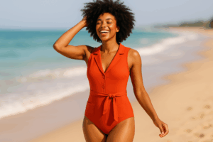 Ваш союзник — слитный купальник с усиленными чашками, широкими бретелями и правильной анатомической посадкой. Ищите модели с внутренней сеткой и эластичными подкладками — они мягко собирают силуэт, не ограничивая свободу. Высокий вырез на бедре визуально удлиняет ноги, а V-образный вырез балансирует пропорции. Если грудь большая, обратите внимание на чашки с формованной основой и регулируемыми бретелями.