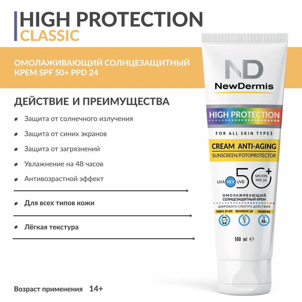 3 шт !!! 1700Р вместо 2360Р HIGH PROTECTION CLASSIC Омолаживающий солнцезащитный крем SPF 50+ PPD24 — это инновационный многофункциональный крем для ежедневного использования на основе современных безопасных компонентов с защитой SPF 50+ PPD 24. Обеспечивает максимальную защиту от всех видов излучения UVA/UVB, защиту от синего света (HEV), излучаемого солнцем или электронными устройствами как вне, так и внутри помещений. Предотвращает появление мимических морщин, ускоряет процессы восстановления кожи и эпидермальное обновление. Инкапсулированная форма комплекса обеспечивает пролонгированное увлажнение кожи. Мощный антиоксидантный комплекс защищает от негативного воздействия свободных радикалов. Предотвращает повреждения ДНК клеток, вызванных солнечным излучением, устраняя разрушение коллагена. Снимает воспалительные процессы внутри клеток, помогает восстановить кожу после стресса. Нежный, легко впитывающийся и не оставляющий белых следов на коже. Прекрасная основа под макияж.