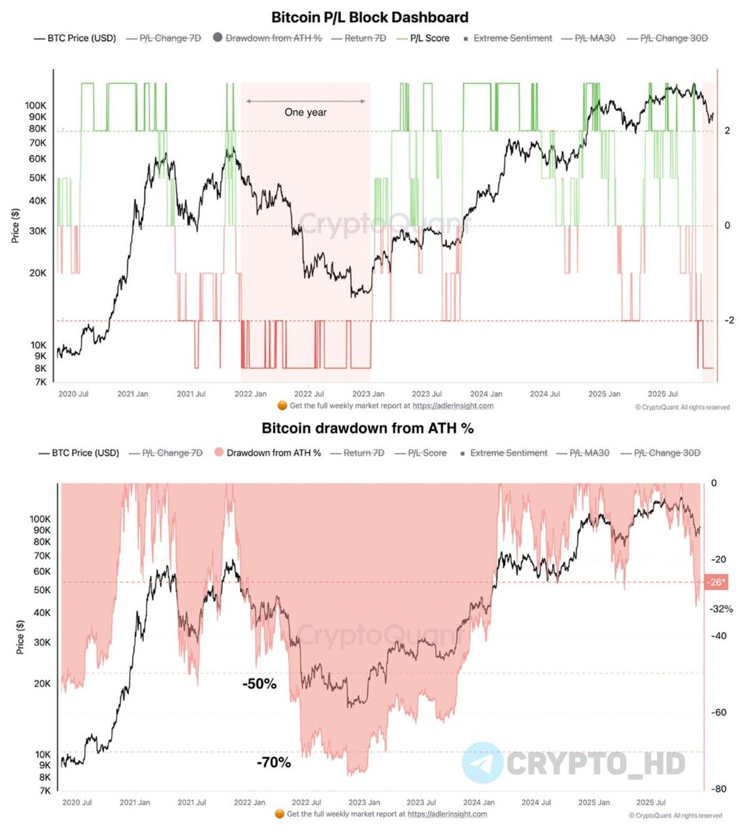 #ончейн 🧸 Аналитики CryptoQuant предупреждают о высокой вероятности продолжения коррекции Биткоина. Медвежьи сигналы: большинство холдеров BTC сейчас в минусе (индикатор UTXO), отсутствие улучшений в ончейн-динамике, макрофон, ликвидность. Crypto Headlines