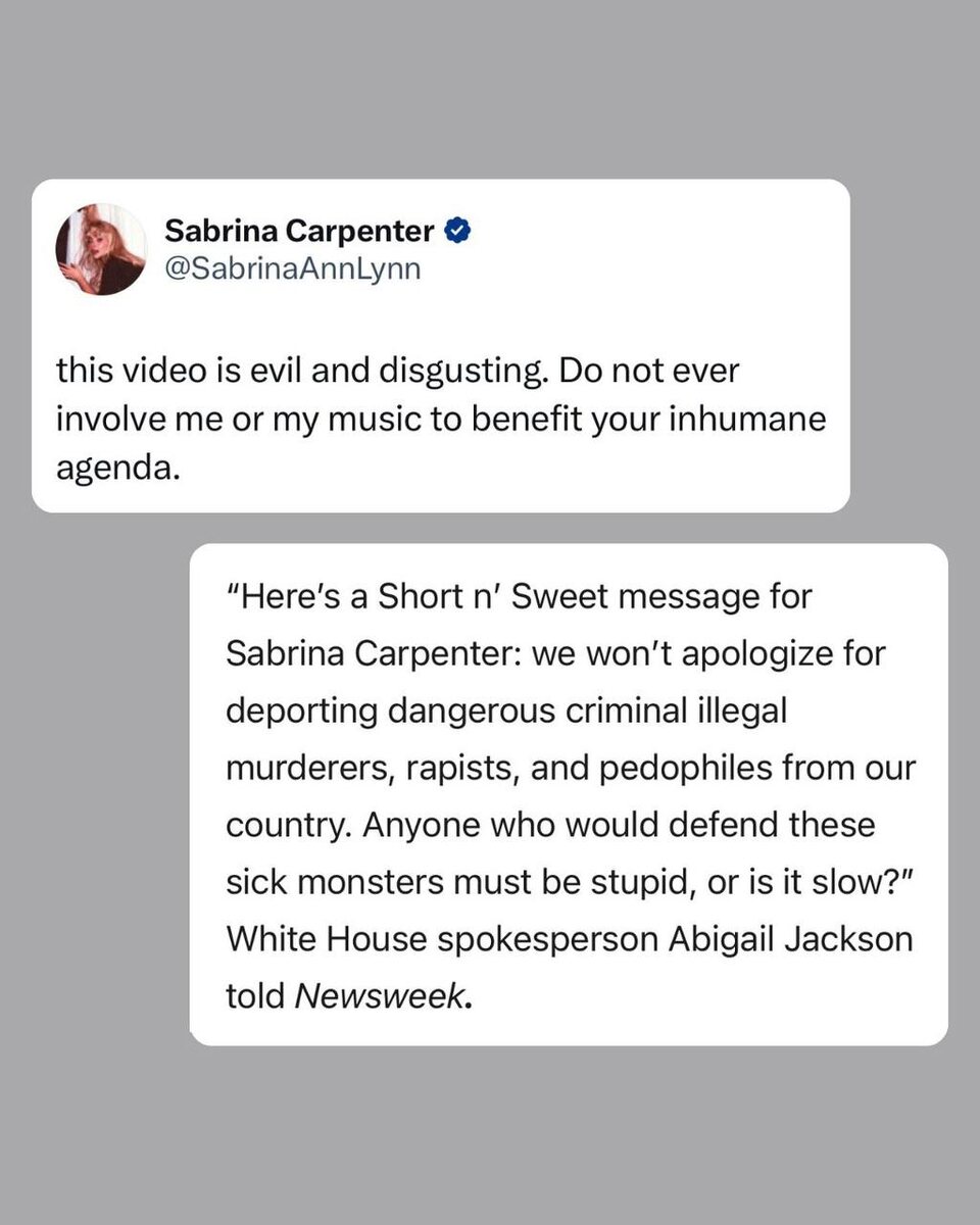 Сабрина Карпентер под конец года ввязалась в словесную перепалку с Белым домом. Сммщики Трампа, как всегда, без разрешения взяли музыку для тиктоков босса - в этот раз про депортацию, - и понеслось. Карпентер тут же по примеру коллег отметилась в комментариях, чтобы, не дай бог, не подумали, что она дала право на использование своей музыки (Тейлор Свифт при этом до сих пор молчит). В этот раз Белый дом решил пойти дальше, и певице вдогонку ответила пресс-секретарь Эбигейл Джексон, которой, очевидно, подсказали пару отсылок песням Сабрины. Ждем ответку певицы.