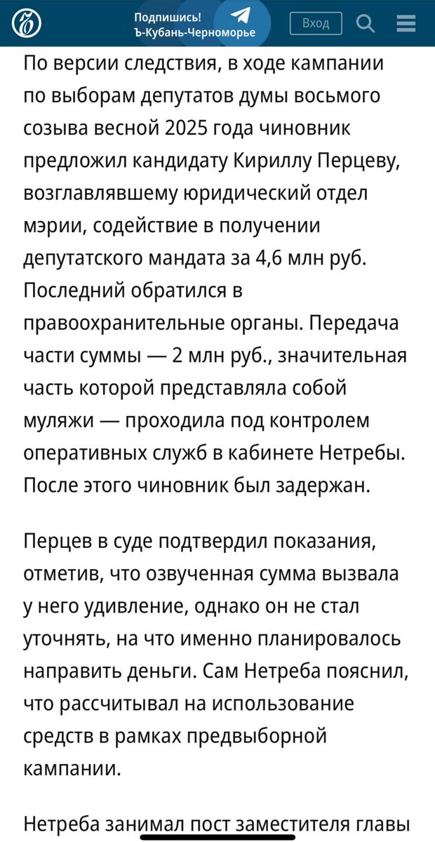 Так, еще раз, вице-мэр Краснодара попросил у кандидата в депутаты гордумы на выборах 2025 года 4,6 млн руб за мандат? А сумма такая
