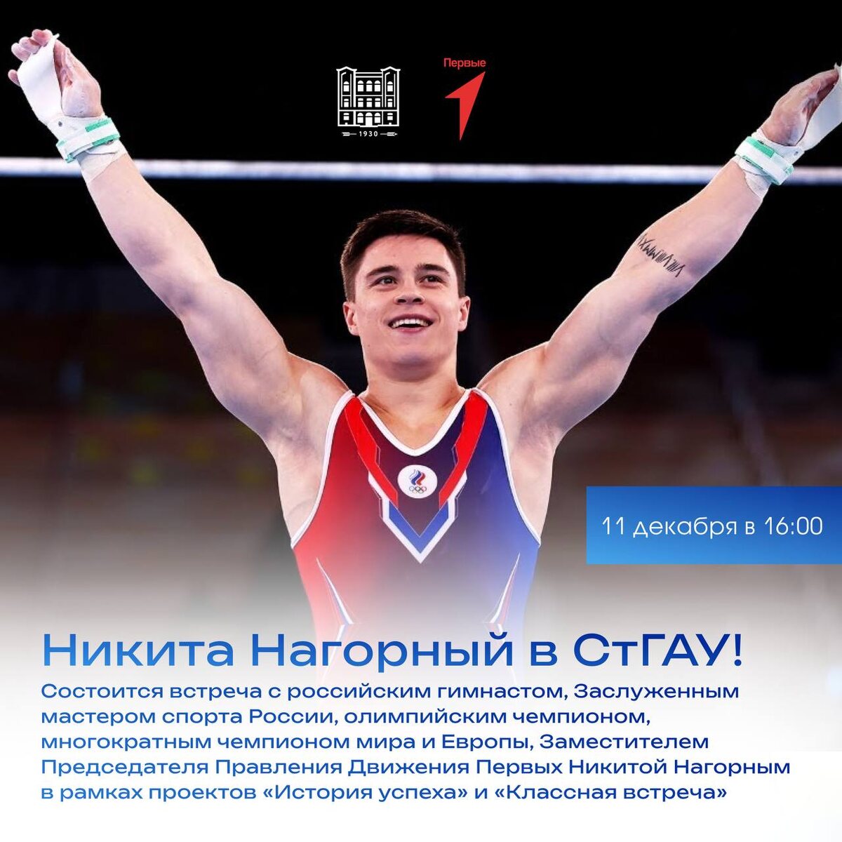 Олимпийский чемпион Никита Нагорный поделится своей историей успеха в СтГАУ! 🏆 Никита Нагорный — российский гимнаст, Заслуженный мастер спорта России, олимпийский чемпион, многократный чемпион мира и Европы, Заместитель Председателя Правления Движения Первых. Встреча проходит при поддержке Движения Первых в рамках проектов «История успеха» и «Классная встреча». 🗓️ 11 декабря в 16:00 📍 Актовый зал СтГАУ 🔗 Регистрируйся по ссылке СтГАУ в МАХ