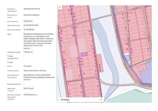 Название: Земельный участок (далее – участок), категории земель населенных пунктов с кадастровым номером 02:39:090401:664, площадью 1800 кв. м, расположенного по адресу: Российская Федерация, Республика Башкортостан, муниципальный район Мишкинский район, сельское поселение Мишкинский сельсовет, село Мишкино, улица Актуганова, земельный участок 81а, с видом разрешенного использования: для ведения личного подсобного хозяйства (приусадебный земельный участок) Канал: Госземля Республика Башкортостан Область: - Район: - Населенный пункт: - Локация: Смотреть на карте ВРИ: Для ведения личного подсобного хозяйства (приусадебный земельный участок) Кадастровый номер: 02:39:090401:664 Кадастровая стоимость: - Вид сделки: Аренда Площадь: 1500 м² Начальная цена: 3033.00 руб. Дата завершения: 14.12.2025 Подробнее: ГИС ТОРГИ #госземля #земляотгосударства #земля #земельныйучасток #земельныеторги #торги #аукцион #арендаземли #аренда #республикабашкортостан