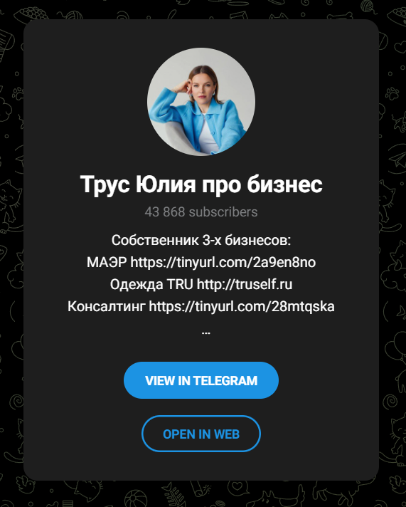 Все что нужно - ПОДПИСАТЬСЯ и прочитать закрепленный пост 💸 🙂 ЧТО ЗА КАНАЛ «ТРУС ЮЛИЯ ПРО БИЗНЕС» Канал ориентирован на действующих предпринимателей и тех, кто только планирует запускать своё дело: посты о поиске ниши, управлении командой, личной эффективности, росте выручки и выгорании. В отличие от жёстких «ставочных» или «крипто»‑проектов, здесь акцент на классическом бизнесе: услуги, малый и средний бизнес, офлайн и онлайн‑проекты. Юлия использует канал как медийную площадку: публикует короткие заметки и разборы типичных ошибок п