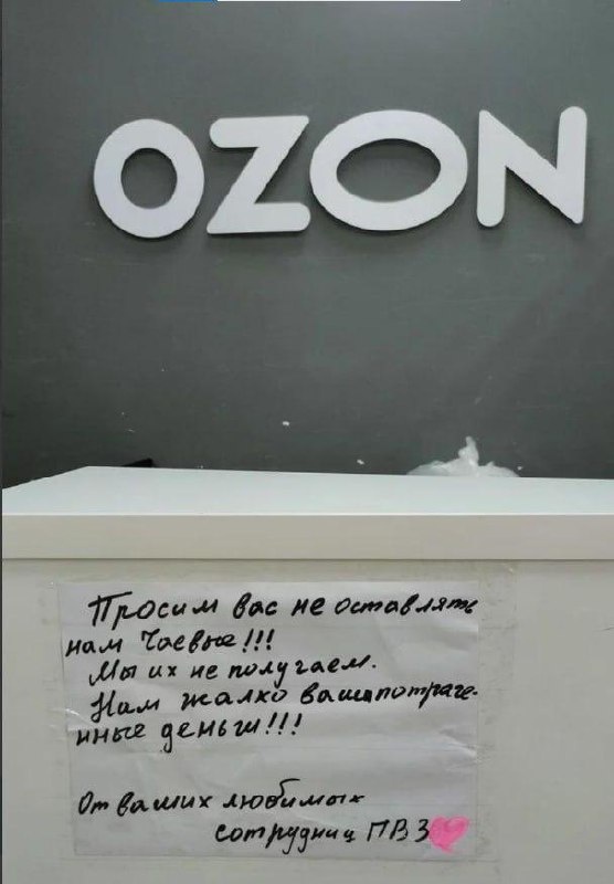 Чаевые на Ozon: до кого они доходят на самом деле? В сети разлетелась фотография из одного из ПВЗ Ozon. Сотрудники прямо просят не оставлять им чаевые, потому что «мы их не получаем, нам жалко ваши потраченные деньги». И это, к сожалению, не удивляет. В моём чате селлеры и клиенты уже делились похожими историями: часть сотрудников ПВЗ оформлены неофициально или через подрядчиков — и просто не имеют технической возможности получить выплаты из Ozon Банка. То есть клиент искренне оставляет деньги «на чай», Ozon красиво показывает галочки и интерфейсы… а до живых людей эти деньги не доходят. Вопрос только один: если сотрудники их не получают, то кто получает? Если у вас есть опыт работы в ПВЗ или истории с чаевыми — расскажите в комментариях. Интересно собрать реальную картину. Похоже на глобальную афёру маркетплейса🤔 Marketplace_biz - отдай свой буст каналу