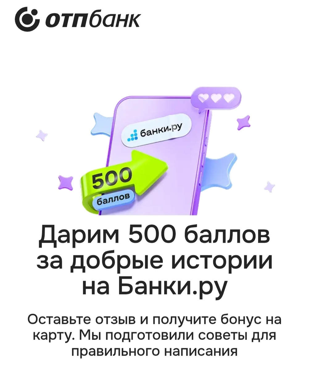 Некоторые банки обещают вознаграждение за написание хвалебных отзывов на Банки ру В качестве благодарности могут предложить деньги, бонусные баллы или сертификаты 💸 🔈 Подобные акции обычно не афишируются (по понятным причинам), но мне удалось собрать информацию по актуальным предложениям в популярных банках Вот что сейчас актуально ОТП Банк 500 баллов • Необходимо иметь дебетовую ОТП карту и получить приглашение на участие (можно напроситься через поддержку). • Иметь как минимум одну покупку по карте от 500₽ в период с 15.08.25 по 31.12.25. • Максимум 500 баллов за всю акцию (до 31.12.25). Альфа Банк 300 - 500 рублей • Номер аккаунта на Банки ру должен совпадать с номером в банке. • Деньги начисляются автоматически в течении 2х недель после того, как отзыв зачли. • Максимум 2 отзыва (600₽) за всю акцию по 28.02.26. размер бонуса за отзыв может отличаться, лучше уточнить у поддержки. МТС Банк 1 000₽ в OZON • В течение трех дней (после написания отзыва) нужно отправить сс