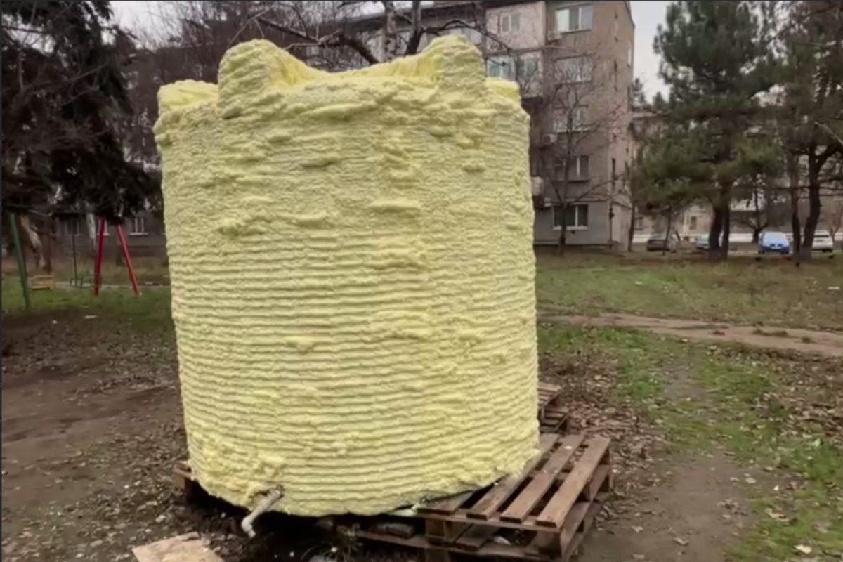 Енакиевцы проявили нестандартный подход в утеплении Народная смекалка в Енакиево предложила свой ответ на вызов зимних температур. На кадрах, полученных от наших читателей, запечатлён крупный резервуар для воды, который подвергся радикальному утеплению. Его цилиндрическая поверхность полностью, от основания до самой горловины, покрыта толстым, словно нанесенным из кондитерского мешка, слоем строительной монтажной пены. Это зрелище выглядит брутально и явно выполнено «на скорую руку» — пена нанесена неравномерными, волнистыми жгутами, создавая рельеф, отдалённо напоминающий гигантскую жёлтую гусеницу. С одной стороны, авторы, очевидно, рассчитывают на высокую теплоизоляционную способность пены, обусловленную её ячеистой структурой. С другой стороны, такое решение ставит множество вопросов. Это, конечно, способ быстро закрыть проблему, но будет ли он работать? Между тем, обычно власти ДНР используют другой подход. Он резко контрастирует с увиденным в Енакиево. Обычно бак укутывают в спец