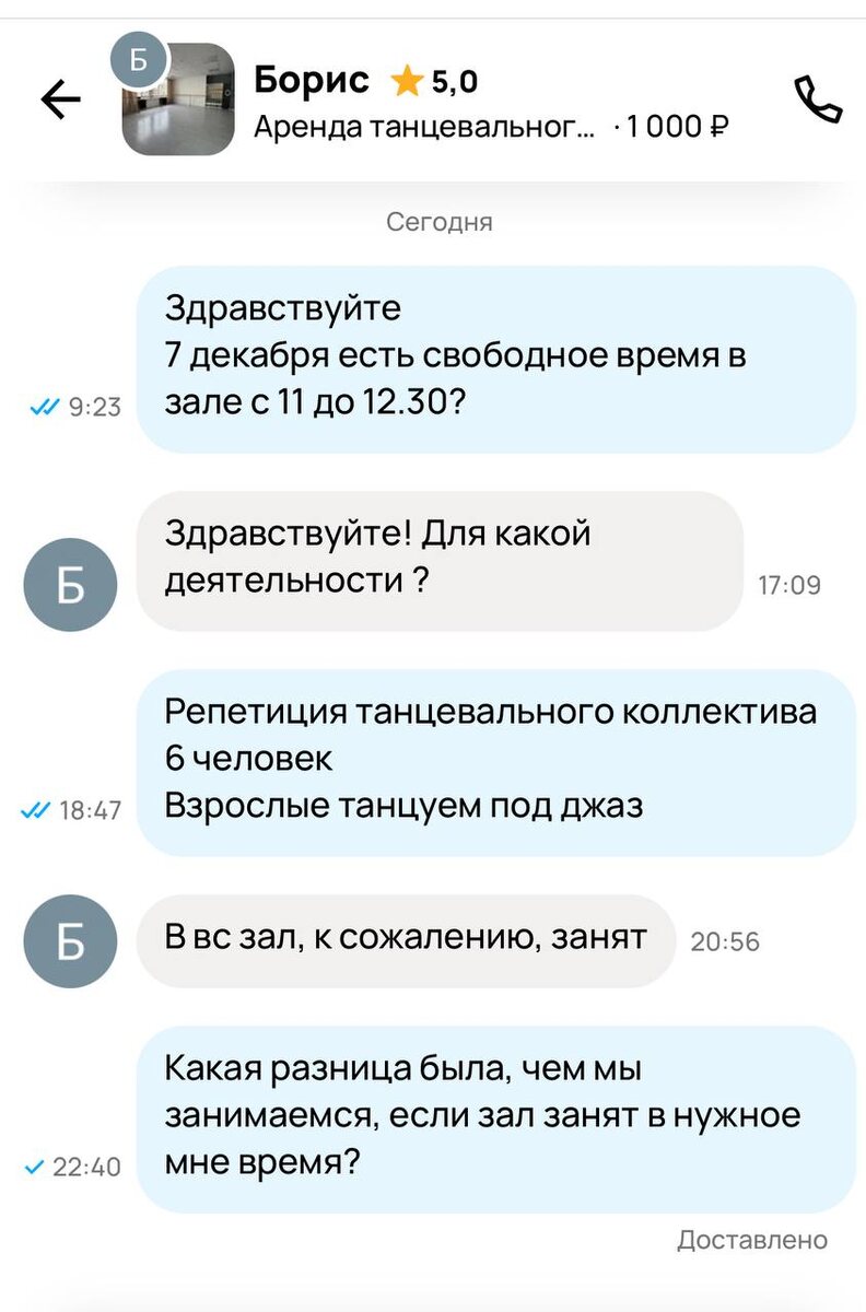 Последнее время часто сталкиваюсь с ужасной коммуникацией в рассылках и взаимодействиях с клиентами. Ищу зал под разовую аренду. Да, иногда залы не сдают под танцы (тут конкретно пишут, что сдают). А иногда не пускают смежные коллективы - про это тоже пишут в объявлениях. Но тут просто трата времени своего и моего. Есть конкретный запрос, конкретное время. Если у тебя занят день и время - скажи сразу. Если любопытно и есть ограничения - спроси потом, чтобы быть в курсе. А вы как думаете? Норм не норм такая переписка?