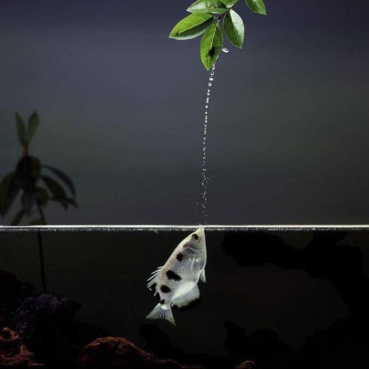 🐟💦 Рыба-брызгун: живой водяной пистолет Знаете ли вы, что рыба-брызгун — единственное позвоночное, которое «стреляет» водой, чтобы добыть пищу? Эта удивительная рыба, обитающая в мангровых лесах Азии и Австралии, сбивает насекомых с веток точными водяными выстрелами. 📌 Тактика охоты: • 🎯 Точность попадания на расстоянии до 2 метров • 💧 Формирование капли воды языком и жаберными крышками • 🐜 Предпочитает мух, пауков и мелких стрекоз 🔬 Механизм «выстрела»: • Специальный желобок на нёбе формирует водяную струю • Зрение корректирует преломление света на границе вода-воздух • Некоторые особи «плюют» сериями по 3-5 выстрелов #рыба_брызгун #биология #охотники #аквариумистика 💫 P.S. Интересно, что молодые брызгуны учатся стрелять с месячного возраста, а к году достигают мастерства снайпера — попадают в цель размером 1-2 мм с первого раза в 95% случаев! В неволе их иногда тренируют сбивать мишени за корм.