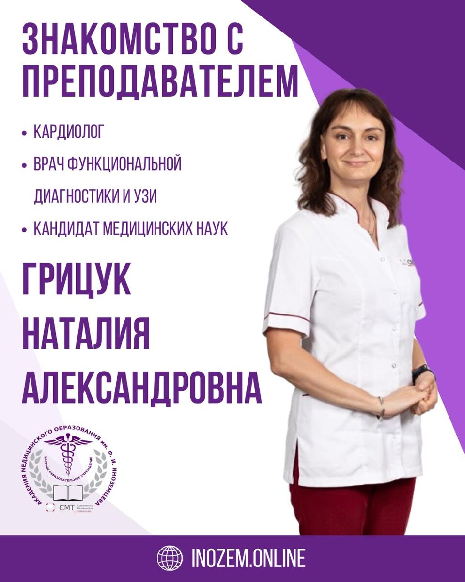 Знакомство с преподавателем: Наталия Александровна Грицук • Кардиолог • Врач функциональной диагностики и УЗИ • Кандидат медицинских наук Сегодня знакомим вас с человеком, который одинаково уверенно работает и в диагностике сложных сердечно-сосудистых состояний, и в преподавании будущим специалистам. 👩⚕️ Наталия Александровна — это: врач УЗИ и функциональной диагностики 0+ кардиолог с многолетней клинической практикой кандидат медицинских наук преподаватель с большим образовательным опытом в РФ и РБ 🩺 Опыт и карьера 📍 С 2010 года — кардиолог и специалист по УЗ-диагностике в Клиниках СМТ 📍 2008–2010 — врач УЗИ и функциональной диагностики в ГКБ №4 г. Минска, работа в реанимации, интенсивной терапии и постинфарктном отделении 📍 2003–2010 — преподаватель кафедр терапии, кардиологии и функциональной диагностики (БГМУ, ГГМУ) 📍 С 2012 года — первичная специализация по функциональной диагностике в СЗГМУ им. Мечникова 📚 Научные достижения 30 публикаций, включая 5 в журналах