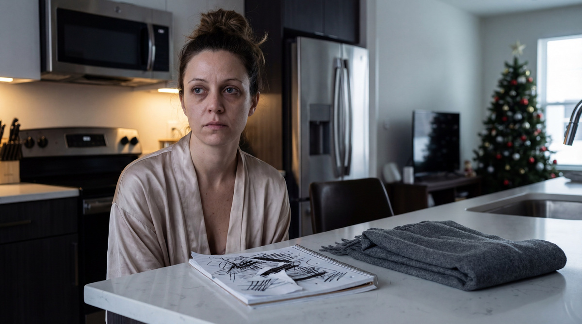 Утро не наступает — вползает в кухню липкой серой жижей, от которой мурашки по коже. Чашка кофе на столе давно остыла, поверхность покрылась противной белой пленкой, как кожа на скисшем молоке. Протягиваю руку — пальцы ощущают холод фарфора, проникающий в ладонь. Запах горелого тоста висит в воздухе, смешанный с вчерашним потом из комнаты детей. Телефон в руке — календарь горит: 5 декабря 2025. 27 дней до Нового года. Для кого-то мандарины и фейерверки, для меня — отсчет до казни в мишуре.