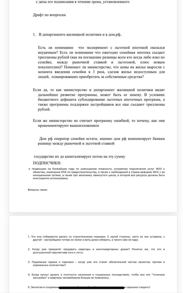 В ответ на пост Хотел в финале приоткрыть завесу тайны, а до конца не получится. Выше головы прыгнули. Если попытаться максимально в общих чертах обрисовать, то была серия встреч в профильном министерстве у моих коллег по одному важному делу, и имелся ярлык от хана на ответы на все вопросы. Я, узнав об этом, сформировал и передал список еще и не относящихся к теме вопросов от нашего канала. Вопросы были сформулированы в очень критическом ключе по поводу программы семейной ипотеки, ее негативном влиянии. Были также изложены мнения нашего канала по широкому кругу вопросов. Получилось во многом донести vox populi подписчиков, а значит почти профессионального сообщества, до самого верха. Но произошло неожиданное, наши вопросы и мнения не только выслушали, но и согласились, немного опешив, видимо, от того, что мы тут чего-то тоже понимаем. Причем в таких формулировках, что я не смогу здесь написать кто именно согласился, из уважения за откровенность. Сессия с коллегами проходила на ур