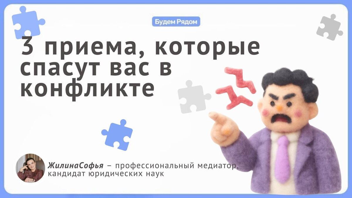 3 приема, которые спасут вас в конфликте Есть 3 базовых приема, которые помогут вам удержать любой конфликт под контролем. Как в семейных проблемах, так и в любых бизнес-переговорах. Потому что работают они одинаково стабильно везде. И если вы начнете применять хотя бы один из них, вас ждет совершенно иная динамика общения. А если все 3, то это будет серьезный апгрейд уровня коммуникации:) Приступим! 1⃣ Один конфликт – одна тема Если у конфликта нет одной четкой темы, обсуждение начинает разваливаться уже через несколько минут. Можно начать с того, что «ты опять опоздал», а закончить обвинениями и упреками десятилетней давности: «а помнишь, как тогда ты сделал…». Почему так происходит? Потому что конфликт – это эмоции. Голова отключается, и включается защитный режим: собрать все старые претензии с запыленных полок, выложить их на стол и доказать, что «я не сумасшедший, так было всегда». Но если перемешивать все темы сразу, никакую из них решить невозможно. Вы говорите о 15 вещах од