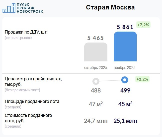 Старая Москва. Ноябрь 2025. Итоги продаж по ДДУ. 🏙 Сделки 5 861 сделки по ДДУ в ноябре 2025 (+7,2% за месяц). 💰Цены и предложение На конец ноября средняя цена метра составила 499 тысяч рублей (+11 000 рублей за метр, без премиум и элит сегментов). На начало декабря (на сегодня) средневзвешенная цена метра растёт, 500 тысяч рублей. 🔸Цена метра в сделках с ДДУ выросла до 461 тысяча рублей (+16 тыс. рублей, +3,6%). Средний бюджет покупки вырос, в среднем 25,1 млн рублей за лот (+0,4 млн за месяц). Средняя площадь проданного по ДДУ лота в ноябре - 45 м² (-2 м² за месяц). 📈 Доля ипотечных сделок 62,0% (в октябре было 61,0%). Смотрите детальные графики, топ девелоперов и старты продаж октября на нашем сайте https://pulsprodaj.ru/news/noiabr-2025-moskva-staraia/ 🔥 @pulsprodaj