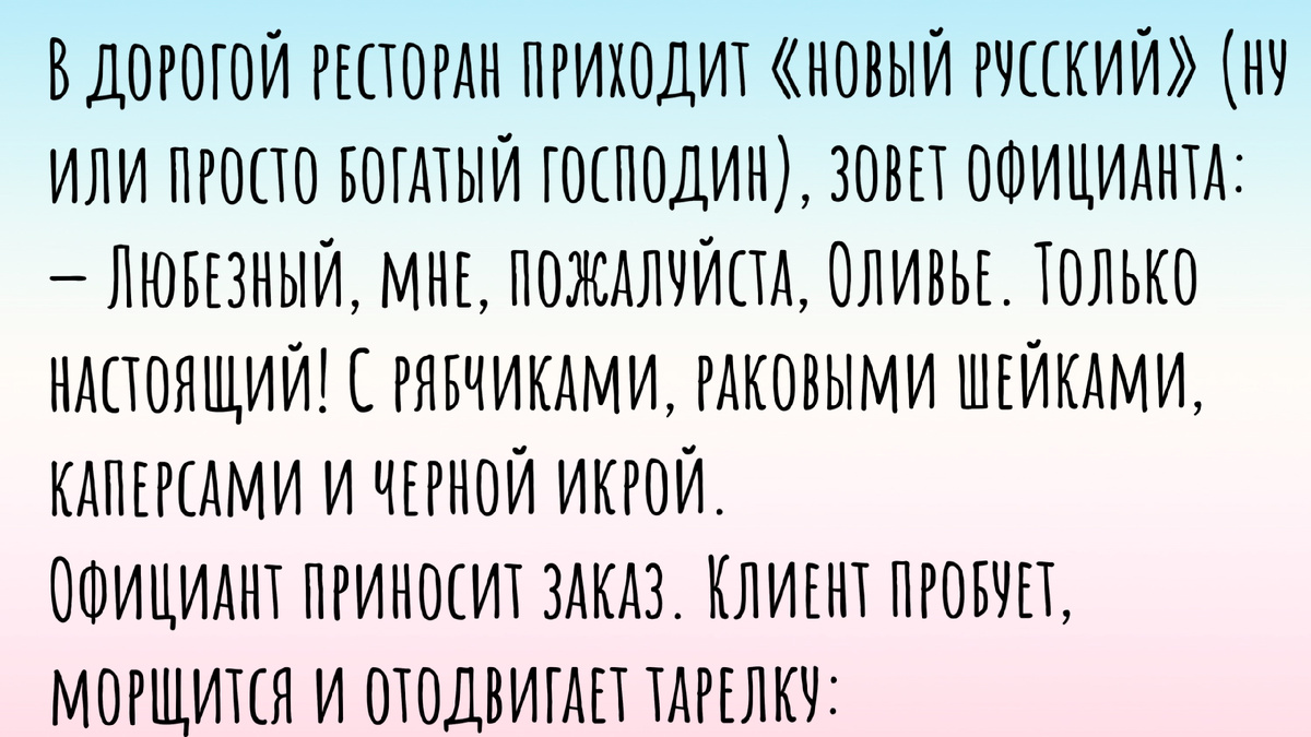 — Витя! — воскликнула она. — Божественно! Наконец-то нормальный мужик, который умеет готовить, а то мой бывший меня одними рукколой и смузи кормил! Это лучший Оливье в моей жизни!