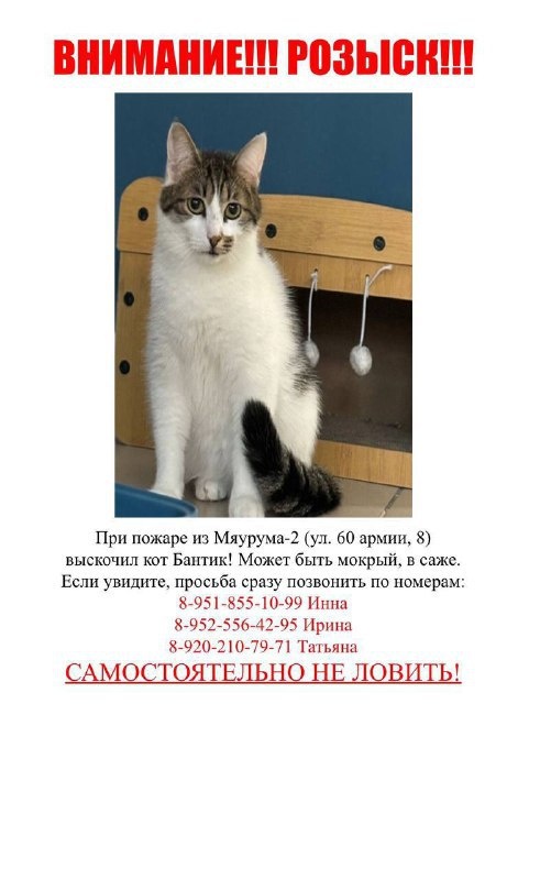 На улице 60-й Армии произошло возгорание в кафе. Повреждена мебель, огонь успешно ликвидирован. В результате происшествия погиб один питомец, двое пропали без вести. Специалисты оценивают состояние оставшихся животных. Всех уцелевших животных временно размещают в муниципальном помещении для дальнейшего ухода и наблюдения.