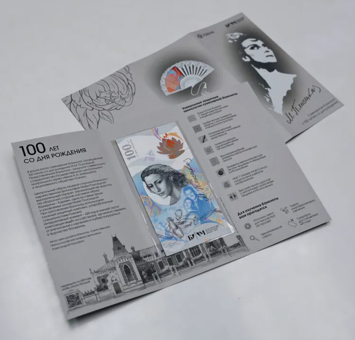 Сувенирная банкнота, посвященная 100-летию М. М. Плисецкой поставляется в буклете.