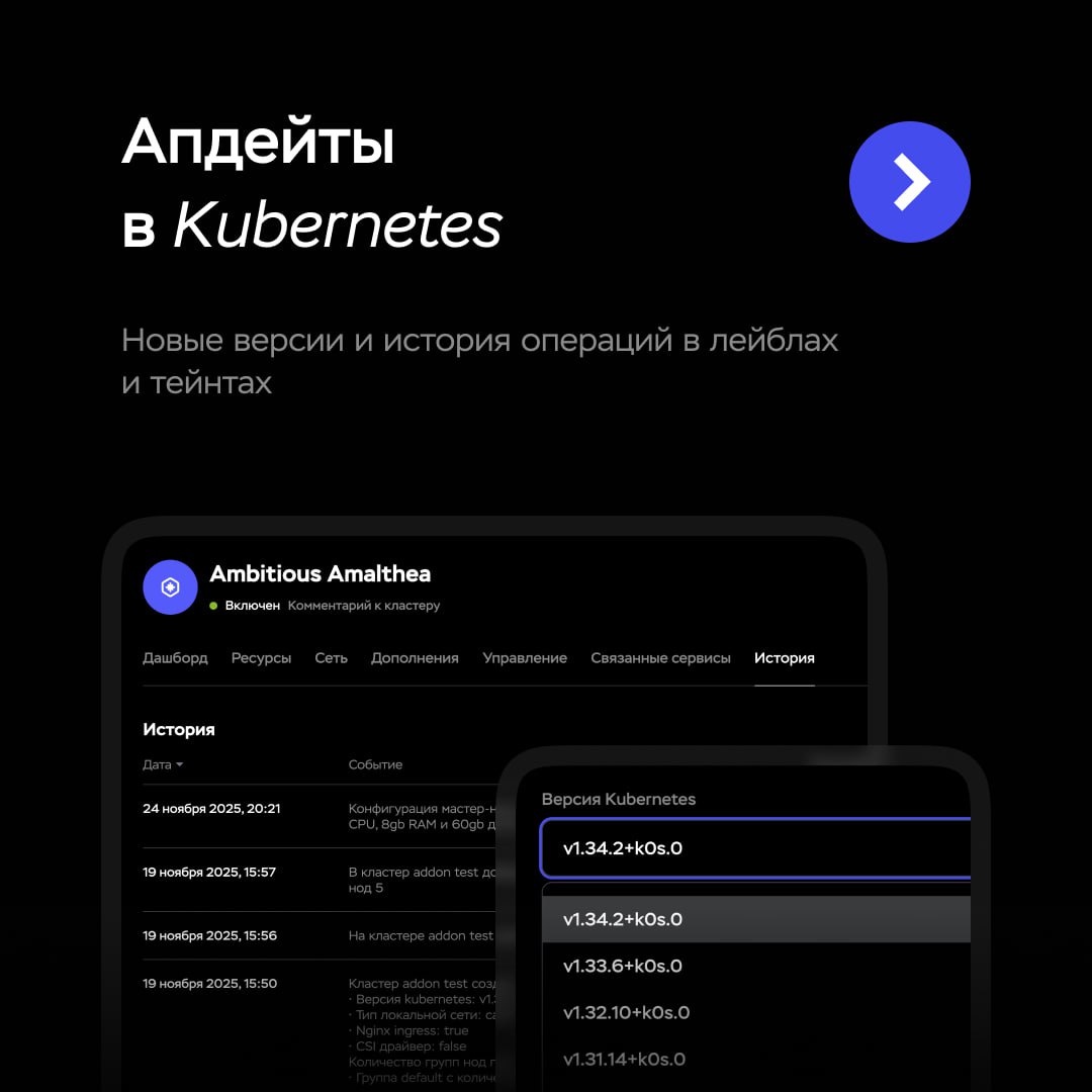 Htkbps d Kubernetes Ой, заело клавиатуру. Но даже eng раскладка не мешает понять, чего нам всем давно не хватало — релизов в Кубере. 1️⃣ Традиционно обновили версии: v1.31.12 → v1.31.14 v1.32.8 → v1.32.10 v1.33.4 → v1.33.6 v1.34.1 → v1.34.2 2️⃣ Добавили в историю записи операций в лейблах и тейнтах. Теперь вы можете узнать, кто и когда менял эти параметры, чтобы быстрее находить причину ошибок в подах. Пример: если вдруг поды перестали назначаться на ноду — смотрите историю тейнтов и видите, кто добавил NoSchedule вчера вечером. Обновить версии в своем кластере →