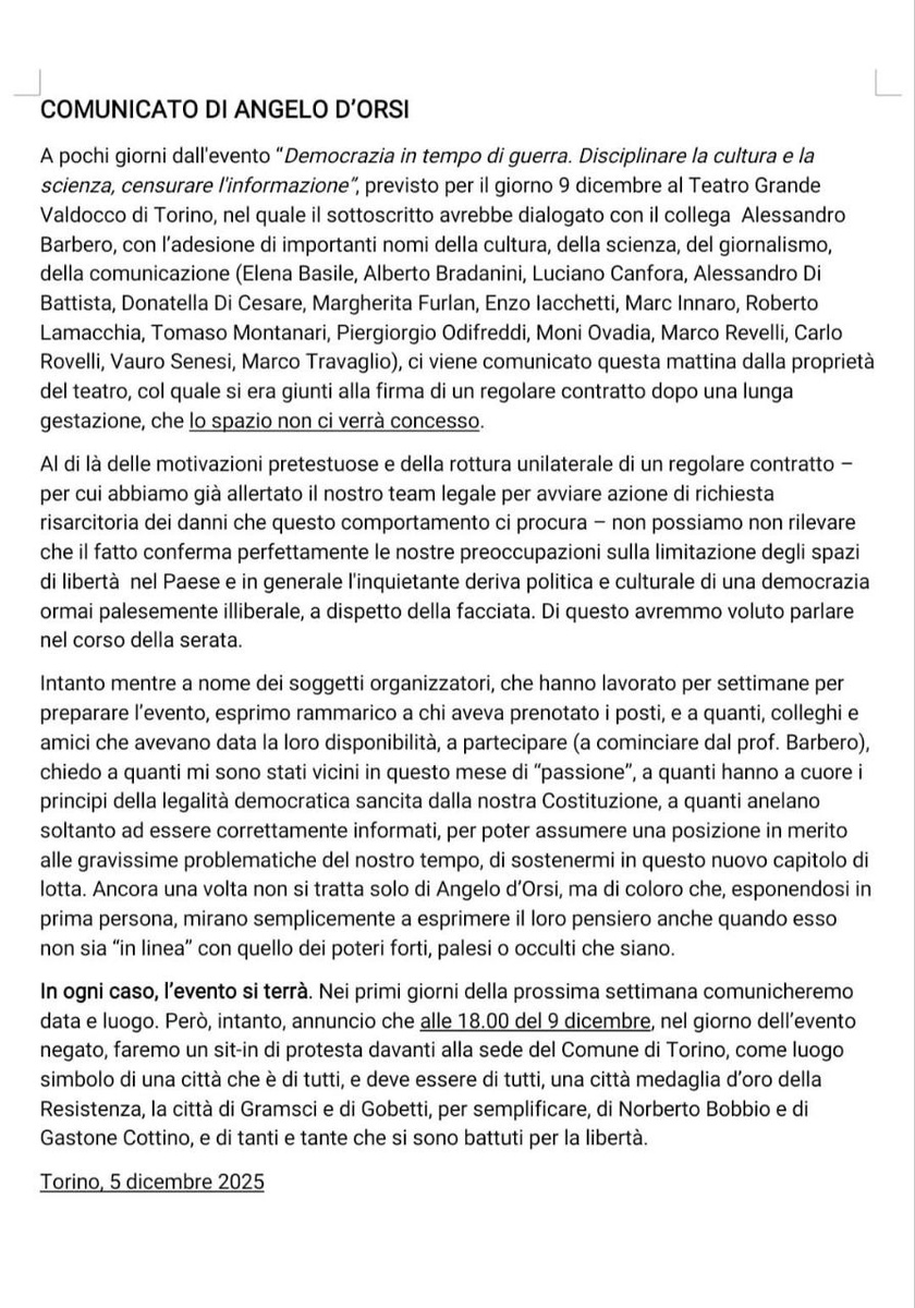 L'Ambasciata Ucraina e i suoi scagnozzi sparsi tra le segreterie di Partito e i sindaci che espongono bandiere gialloblù, continua nella sua opera di ingerenze e CENSURA. Tutta la mia solidarietà al professor Angelo d'Orsi e al professor Alessandro Barbero. 😊Vincenzo Lorusso 👍 Giornalista 🤩 🇷🇺 Autore 📱 Donbass Italia 👉